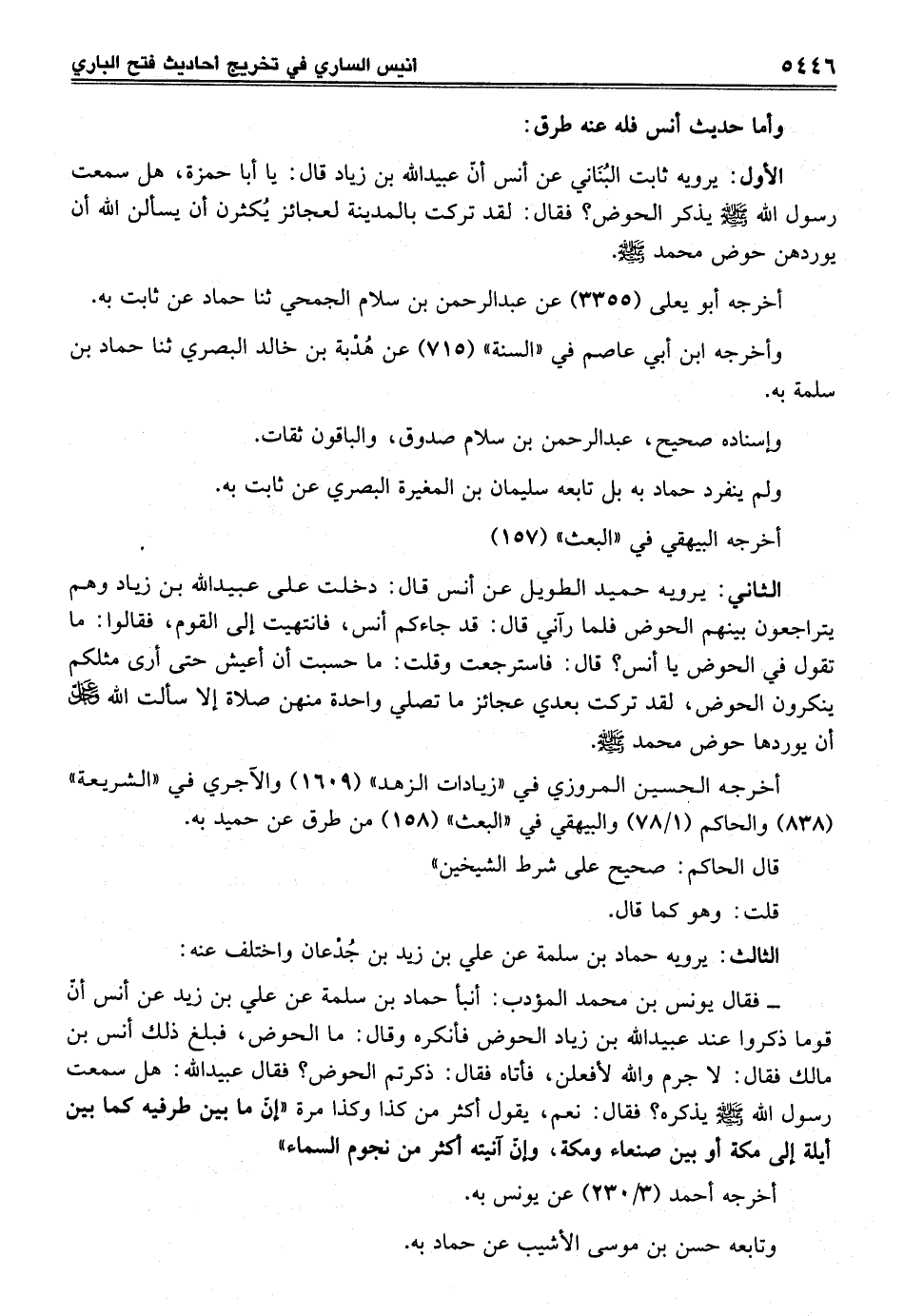 - فقال يونس بن محمد المؤدب: أنبأ حماد بن سلمة عن علي بن زيد عن أنس أنّ قوما ذكروا عند عبيد الله بن زياد الحوض فأنكره وقال: ما الحوض، فبلغ ذلك أنس بن مالك فقال: لا جرم والله لأفعلن، فأتاه فقال: ذكرتم الحوض؟ فقال عبيد الله: هل سمعت رسول الله - صلى الله عليه وسلم - يذكره؟ فقال: نعم، يقول أكثر من كذا وكذا مرة "إنّ ما بين طرفيه كما بين أيلة إلى مكة أو بين صنعاء ومكة، وإن آنيته أكثر من نجوم السماء"