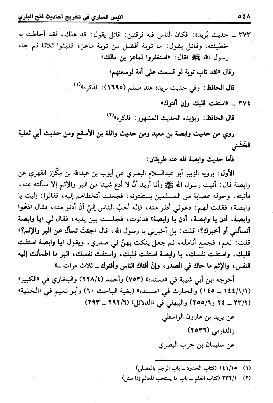 الأول: يرويه الزبير أبو عبد السلام البصري عن أيوب بن عبد الله بن مِكْرَز الفهري عن وابصة قال: أتيت رسول الله - صلى الله عليه وسلم - وأنا أريد أنْ لا أدع شيئا من البر والإثم إلا سألته عنه، فأتيته، وحوله عصابة من المسلمين يستفتونه، فجعلت أتخطاهم إليه، فقالوا: إليك يا وابصة، فقلت لهم: دعوني أدنو منه، فإنه أحبّ الناس إليّ أنْ أدنو منه، فقال "دَعُوا وابصة، أدن يا وابصة، أدن يا وابصه" فدنوت، فجلست بين يديه، فقال لي "يا وابصة أتسالني أو أخبرك؟ " قلت: بل أخبرني يا رسول الله، قال "جئتَ تسأل عن البر والإثم؟ " قلت: نعم، فجمع أنامله، ثم جعل ينكت بهنّ في صدري، ويقول "يا وابصة استفت قلبك، واستفت نفسك، يا وابصة استفت قلبك، واستفت نفسك، البر ما اطمأنت إليه النفس، والإثم ما حال في الصدر، وإن أفتاك الناس وأفتوك - ثلاث مرات ـ"