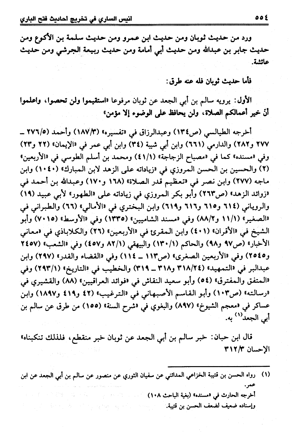 قال ابن حبان: خبر سالم بن أبي الجعد عن ثوبان خبر منقطع، فلذلك تنكبناه" الإحسان 3/ 312