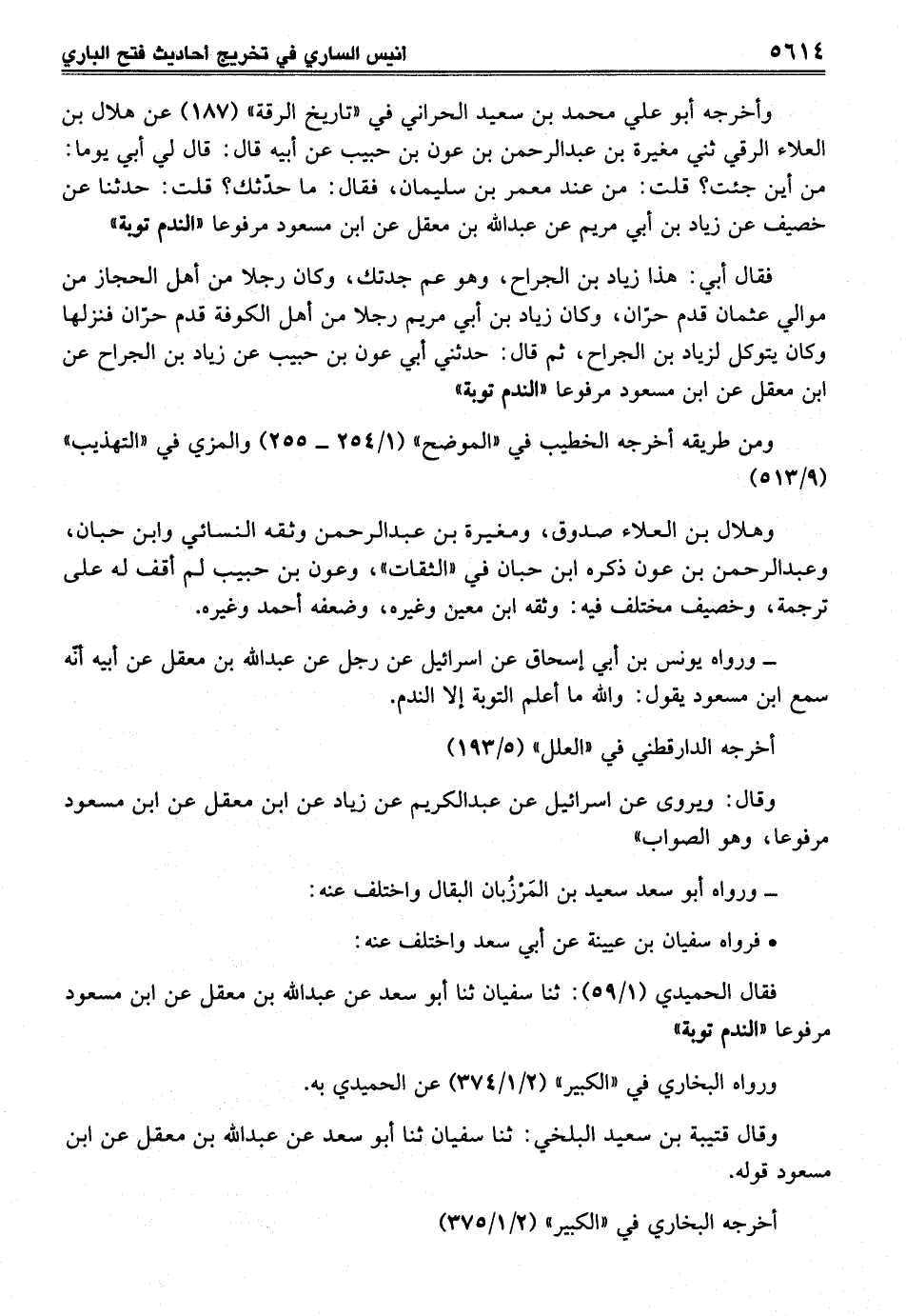 فقال الحميدي (1/ 59): ثنا سفيان ثنا أبو سعد عن عبد الله بن معقل عن ابن مسعود مرفوعاً "الندم توبة"
