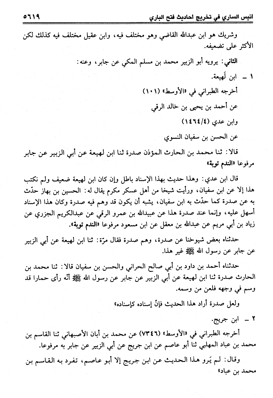 قال ابن عدي: وهذا حديث بهذا الإسناد باطل وإن كان ابن لهيعة ضعيف ولم نكتب هذا إلا عن ابن سفيان، ورأيت شيخا من أهل عسكر مكرم يقال له: الحسين بن بهاز حدّث به عن صدرة كما حدّث به ابن سفيان، يشبه أن يكون قد وهم فيه صدرة وكان هذا الإسناد أسهل عليه، وإنما عند صدرة هذا عن عبيد الله بن عمرو الرقي عن عبد الكريم الجزري عن زياد بن أبي مريم عن عبد الله بن معقل عن ابن مسعود مرفوعا "الندم توبة".