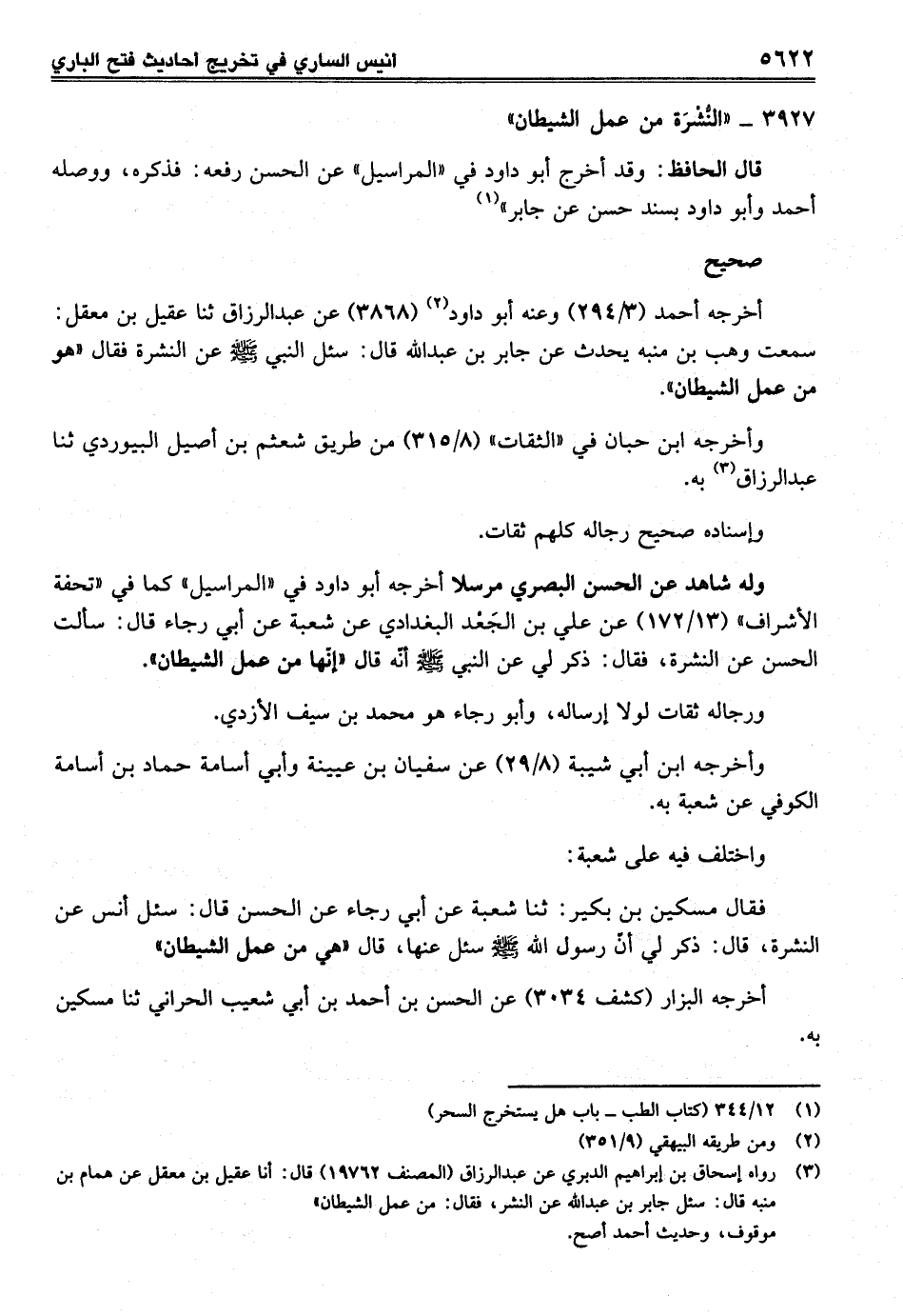 (¬3) رواه إسحاق بن إبراهيم الدبري عن عبد الرزاق (المصنف 19762) قال: أنا عقيل بن معقل عن همام بن منبه قال: سئل جابر بن عبد الله عن النشر، فقال: من عمل الشيطان"