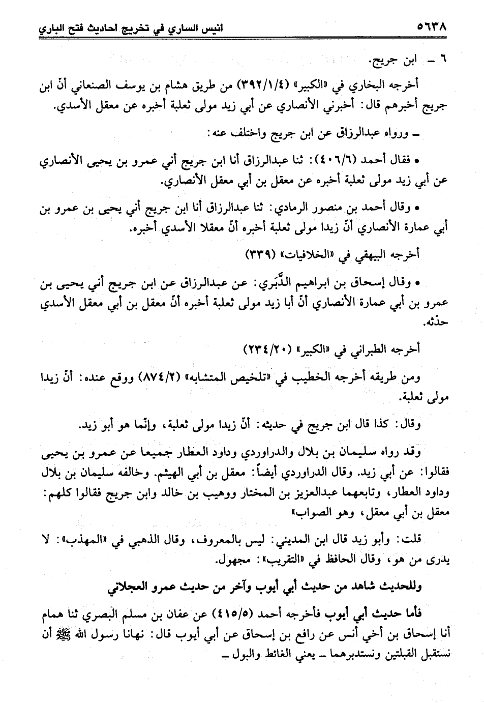 • وقال إسحاق بن إبراهيم الدَّبَري: عن عبد الرزاق عن ابن جريج أني يحيي بن عمرو بن أبي عمارة الأنصاري أنّ أبا زيد مولى ثعلبة أخبره أنّ معقل بن أبي معقل الأسدي حدّثه.