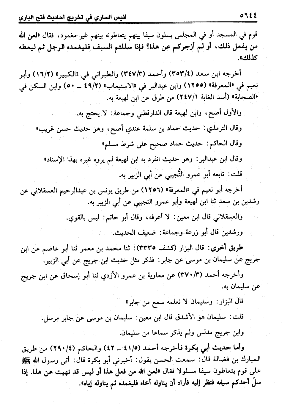 وأما حديث أبو بكرة فأخرجه أحمد (5/ 41 - 42) والحاكم (4/ 290) من طريق المبارك بن فضالة قال: سمعت الحسن يقول: أخبرني أبو بكرة قال: أتى رسول الله -صلى الله عليه وسلم- على قوم يتعاطون سيفا مسلولا فقال "لعن الله من فعل هذا أو ليس قد نهيت عن هذا. إذا سلّ أحدكم سيفه فنظر إليه فأراد أن يناوله أخاه فليغمده ثم يناوله إياه".