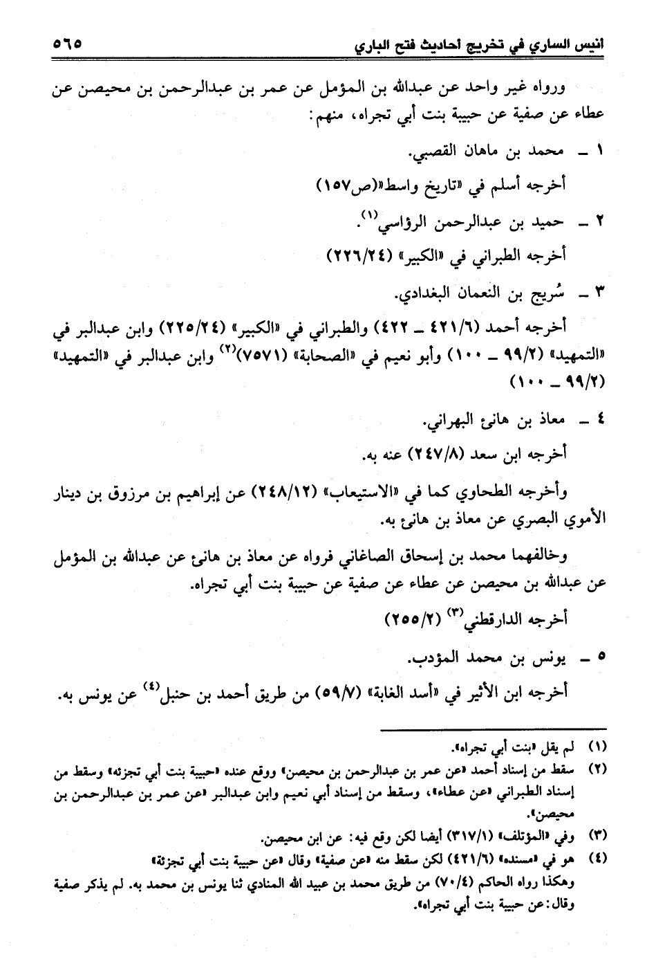 ورواه غير واحد عن عبد الله بن المؤمل عن عمر بن عبد الرحمن بن محيصن عن عطاء عن صفية عن حبيبة بنت أبي تجراه، منهم: