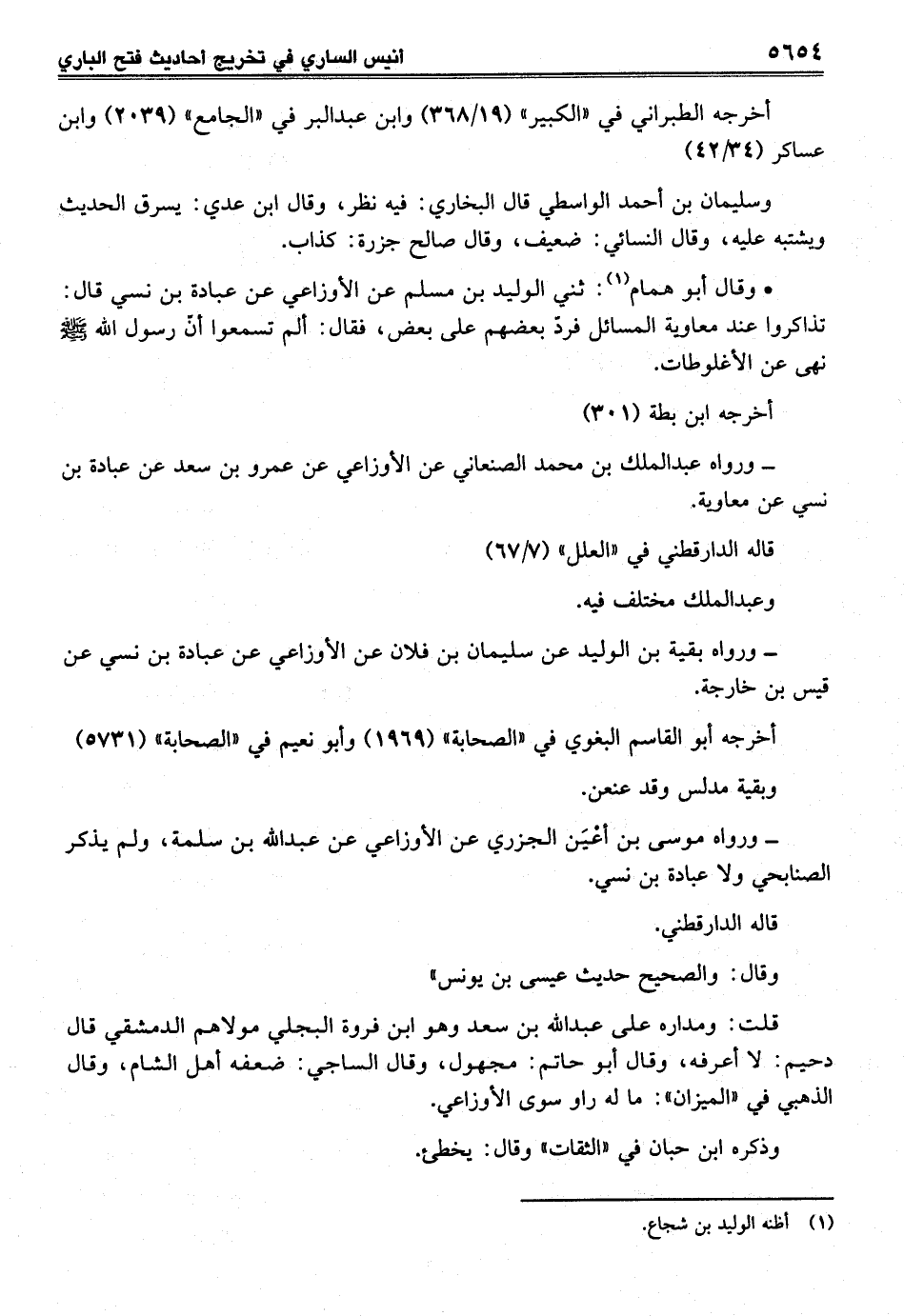 • وقال أبو همام (¬1): ثني الوليد بن مسلم عن الأوزاعي عن عبادة بن نسي قال: تذاكروا عند معاوية المسائل فردّ بعضهم على بعض، فقال: ألم تسمعوا أنّ رسول الله -صلى الله عليه وسلم- نهى عن الأغلوطات.