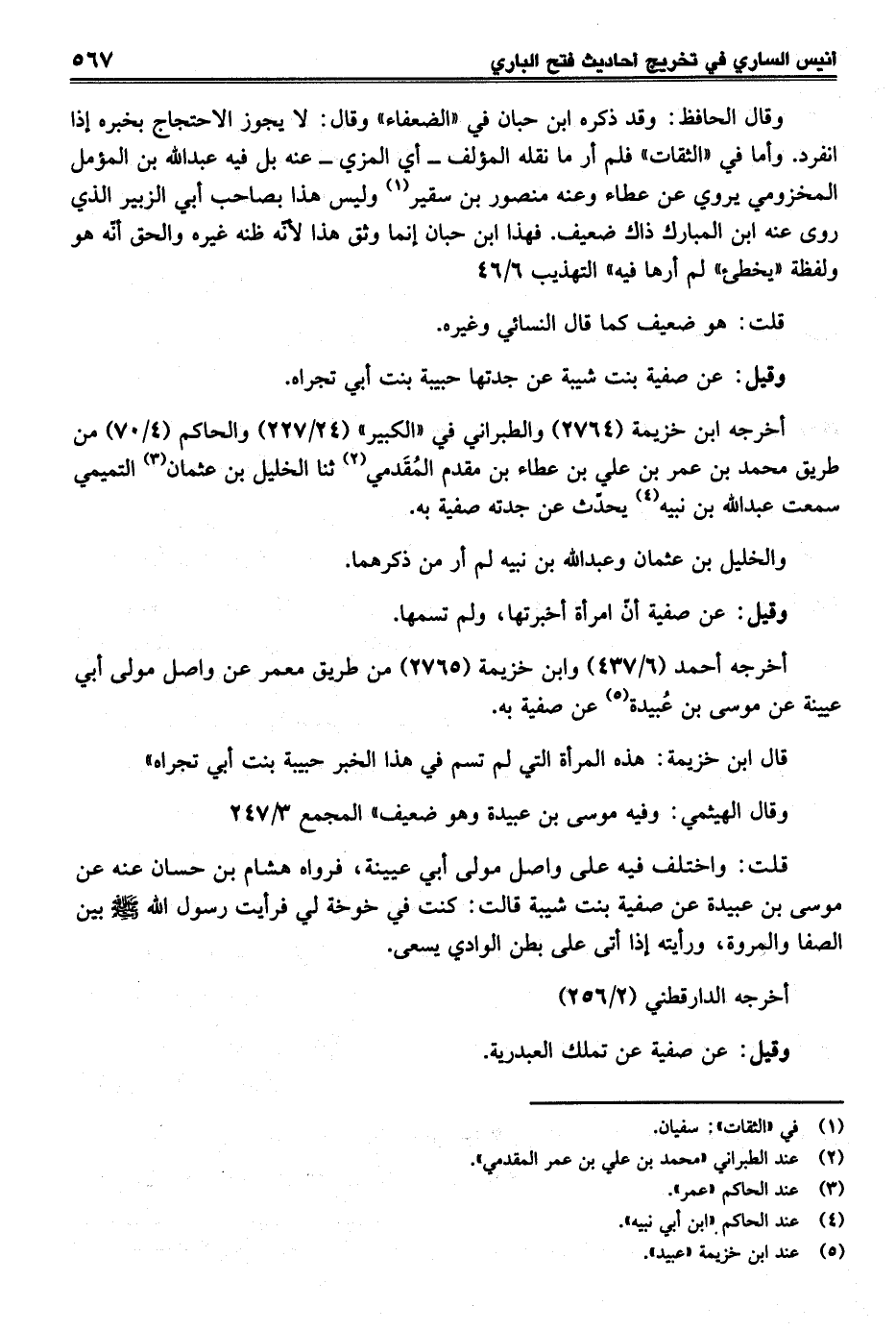 قلت: واختلف فيه على واصل مولى أبي عيينة، فرواه هشام بن حسان عنه عن موسى بن عبيدة عن صفية بنت شيبة قالت: كنت في خوخة لي فرأيت رسول الله - صلى الله عليه وسلم - بين الصفا والمروة، ورأيته إذا أتى على بطن الوادي يسعى.