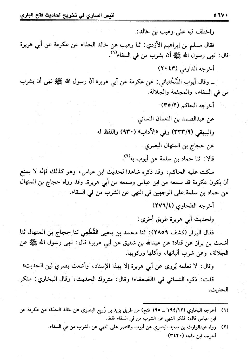 سكت عليه الحاكم، وقد ذكره شاهدا لحديث ابن عباس، وهو كذلك فإنّه لا يمنع أن يكون عكرمة قد سمعه من ابن عباس وسمعه من أبي هريرة. وقد رواه حجاج بن المنهال عن حماد بن سلمة على الوجهين في النهي عن الشرب من في السقاء.