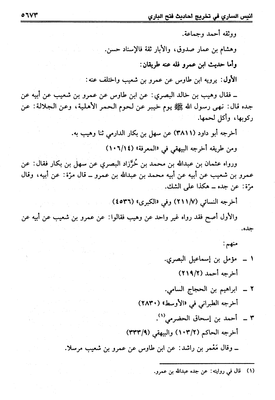 - فقال وهيب بن خالد البصري: عن ابن طاوس عن عمرو بن شعيب عن أبيه عن جده قال: نهى رسول الله -صلى الله عليه وسلم- يوم خيبر عن لحوم الحمر الأهلية، وعن الجلالة: عن ركوبها، وأكل لحمها.