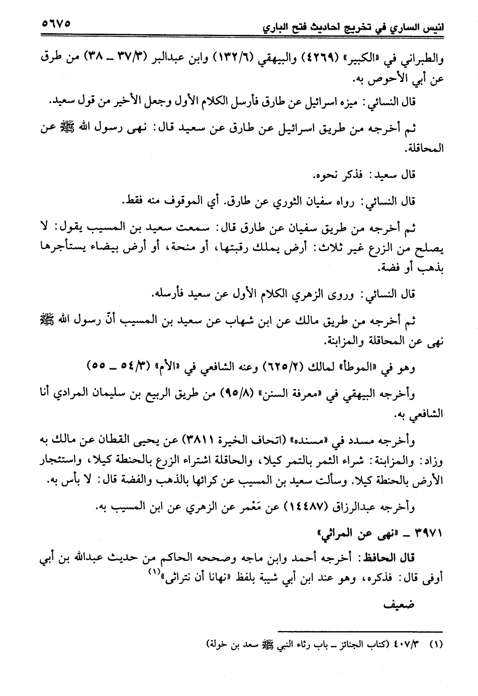 ثم أخرجه من طريق مالك عن ابن شهاب عن سعيد بن المسيب أنّ رسول الله -صلى الله عليه وسلم- نهى عن المحاقلة والمزابنة.