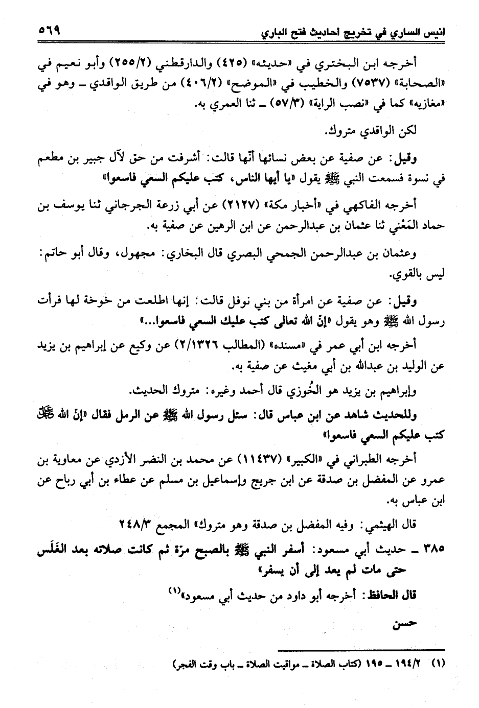 وقيل: عن صفية عن امرأة من بني نوفل قالت: إنها اطلعت من خوخة لها فرأت رسول الله - صلى الله عليه وسلم - وهو يقول "إنّ الله تعالى كتب عليك السعي فاسعوا ... "
