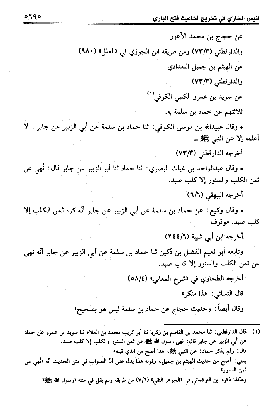 (¬1) قال الدارقطني: ثنا محمد بن القاسم بن زكريا ثنا أبو كريب محمد بن العلاء ثنا سويد بن عمرو عن حماد عن أبي الزبير عن جابر قال: نهى رسول الله -صلى الله عليه وسلم- عن ثمن السنور والكلب إلا كلب صيد.