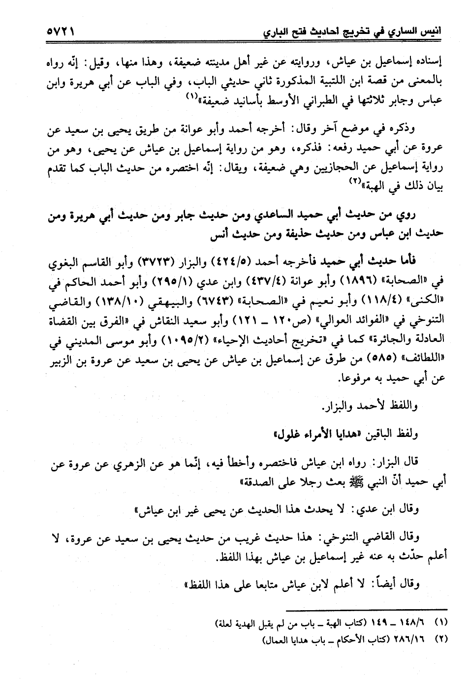 وذكره في موضع آخر وقال: أخرجه أحمد وأبو عوانة من طريق يحيى بن سعيد عن عروة عن أبي حميد رفعه: فذكره، وهو من رواية إسماعيل بن عياش عن يحيى، وهو من رواية إسماعيل عن الحجازيين وهي ضعيفة، ويقال: إنّه اختصره من حديث الباب كما تقدم بيان ذلك في الهبة" (¬2)
