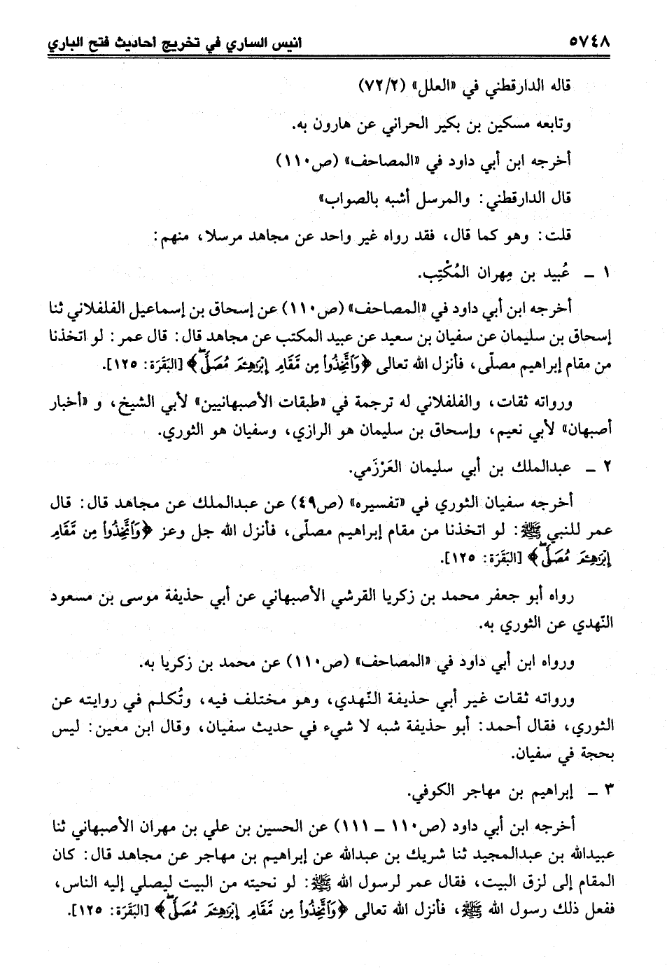أخرجه ابن أبي داود (ص110 - 111) عن الحسين بن علي بن مهران الأصبهاني ثنا عبيد الله بن عبد المجيد ثنا شريك بن عبد الله عن إبراهيم بن مهاجر عن مجاهد قال: كان المقام إلى لزق البيت، فقال عمر لرسول الله - صلى الله عليه وسلم -: لو نحيته من البيت ليصلي إليه الناس، ففعل ذلك رسول الله - صلى الله عليه وسلم -، فأنزل الله تعالى {وَاتَّخِذُوا مِنْ مَقَامِ إِبْرَاهِيمَ مُصَلًّى} [البَقَرَة: 125].