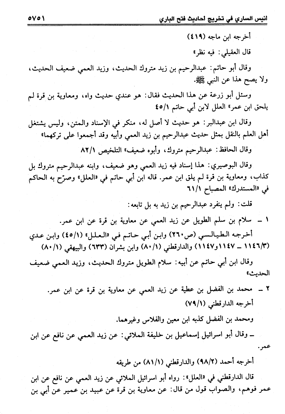 وقال البوصيري: هذا إسناد فيه زيد العمي وهو ضعيف، وابنه عبد الرحيم متروك بل كذاب، ومعاوية بن قرة لم يلق ابن عمر. قاله ابن أبي حاتم في "العلل" وصرّح به الحاكم في "المستدرك" المصباح 1/ 61