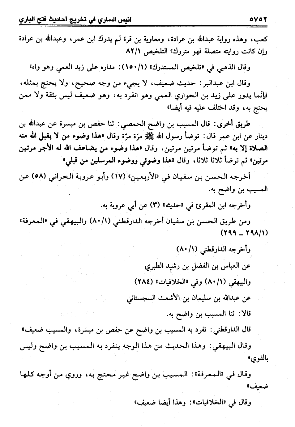 طريق أخرى: قال المسيب بن واضح الحمصي: ثنا حفص بن ميسرة عن عبد الله بن دينار عن ابن عمر قال: توضأ رسول الله - صلى الله عليه وسلم - مرّة مرّة وقال "هذا وضوء من لا يقبل الله منه الصلاة إلا به" ثم توضأ مرتين مرتين، وقال "هذا وضوء من يضاعف الله له الأجر مرتين مرتين" ثم توضأ ثلاثا ثلاثا، وقال "هذا وضوئي ووضوء المرسلين من قبلي"