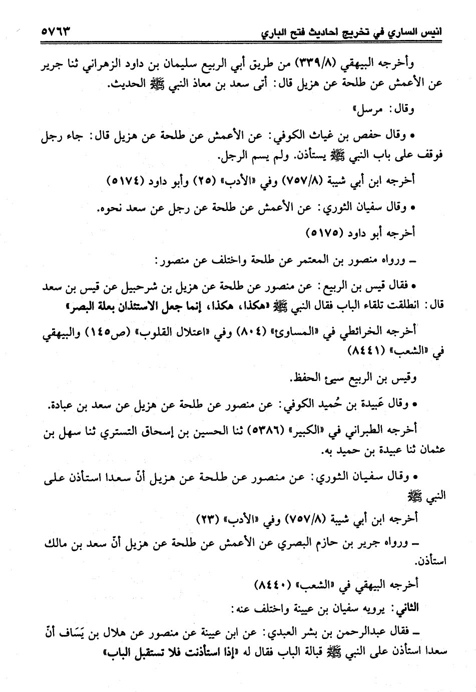 • وقال سفيان الثوري: عن منصور عن طلحة عن هزيل أنّ سعدا استأذن على النبي - صلى الله عليه وسلم -