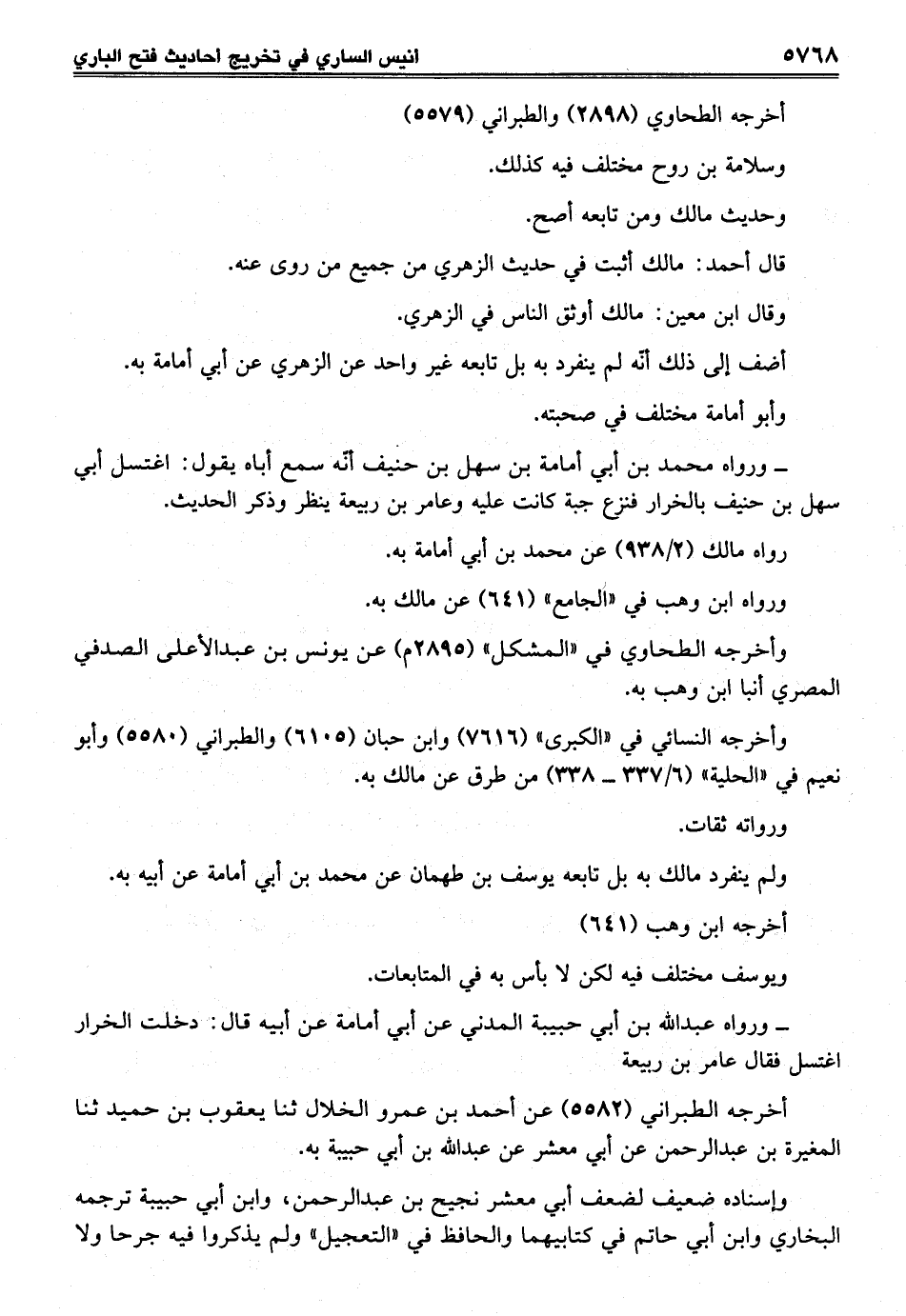 - ورواه محمد بن أبي أمامة بن سهل بن حنيف أنّه سمع أباه يقول: اغتسل أبي سهل بن حنيف بالخرار فنزع جبة كانت عليه وعامر بن ربيعة ينظر وذكر الحديث.