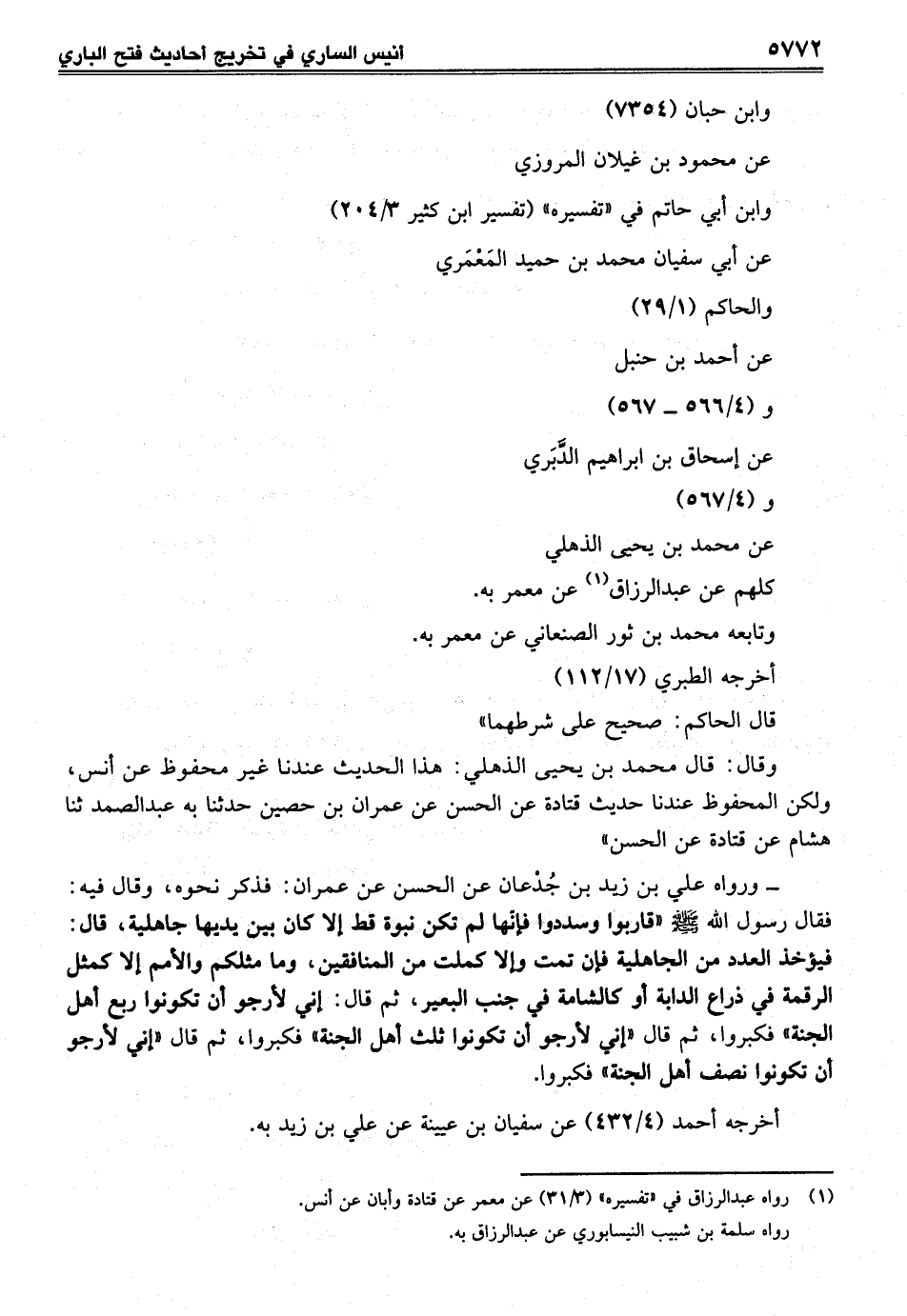 - ورواه علي بن زيد بن جُدْعان عن الحسن عن عمران: فذكر نحوه، وقال فيه: فقال رسول الله - صلى الله عليه وسلم - "قاربوا وسددوا فإنّها لم تكن نبوة قط إلا كان بين يديها جاهلية، قال: فيؤخذ العدد من الجاهلية فإن تمت وإلا كملت من المنافقين، وما مثلكم والأمم إلا كمثل الرقمة في ذراع الدابة أو كالشامة في جنب البعير، ثم قال: إني لأرجو أن تكونوا ربع أهل الجنة" فكبروا، ثم قال "إني لأرجو أن تكونوا ثلث أهل الجنة" فكبروا، ثم قال "إني لأرجو أن تكونوا نصف أهل الجنة" فكبروا.