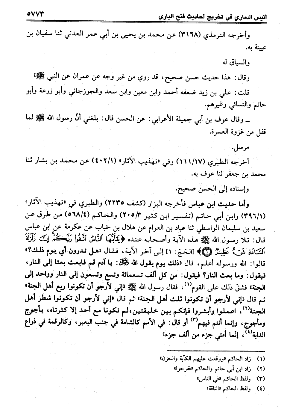 وأما حديث ابن عباس فأخرجه البزار (كشف 2235) والطبري في "تهذيب الآثار" (1/ 396) وابن أبي حاتم (تفسير ابن كثير 3/ 205) والحاكم (4/ 568) من طرق عن سعيد بن سليمان الواسطي ثنا عباد بن العوام عن هلال بن خباب عن عكرمة عن ابن عباس قال: تلا رسول الله - صلى الله عليه وسلم - هذه الآية وأصحابه عنده {يَا أَيُّهَا النَّاسُ اتَّقُوا رَبَّكُمْ إِنَّ زَلْزَلَةَ السَّاعَةِ شَيْءٌ عَظِيمٌ (1)} [الحَجّ: 1] إلى آخر الآية، فقال "هل تدرون أي يوم ذلك؟ " قالوا: الله ورسوله أعلم، قال "ذلك يوم يقول الله -عز وجل-: يا آدم قم فابعث بعثا إلى النار، فيقول: وما بعث النار؟ فيقول: من كل ألف تسعمائة وتسع وتسعون إلى النار وواحد إلى الجنة" فشقّ ذلك على القوم (¬1)، فقال رسول الله - صلى الله عليه وسلم - "إني لأرجو أن تكونوا ربع أهل الجنة" ثم قال "إني لأرجو أن تكونوا ثلث أهل الجنة" ثم قال "إني لأرجو أن تكونوا شطر أهل الجنة (¬2)، اعملوا وأبشروا فإنكم بين خليقتين، لم تكونا مع أحد إلا كثرتاه، يأجوج ومأجوج، وإنما أنتم فيهم (¬3) أو قال: في الأمم كالشامة في جنب البعير، وكالرقمة في ذراع الدابة (¬4)، إنّما أمتي جزء من ألف جزء"