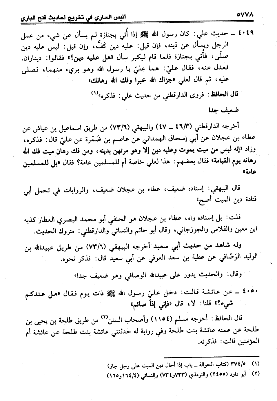 4049 - حديث علي: كان رسول الله - صلى الله عليه وسلم - إذا أُتي بجنازة لم يسأل عن شيء من عمل الرجل ويسأل عن دَينه، فإن قيل: عليه دين كَفَّ، وإن قيل: ليس عليه دين صلّى، فأُتي بجنازة فلما قام ليكبر سأل "هل عليه دين؟ " فقالوا: ديناران. فعدل عنه، فقال عليّ: هما عليّ يا رسول الله وهو بريء منهما، فصلى عليه، ثم قال لعلي "جزاك الله خيرا وفك الله رهانك"