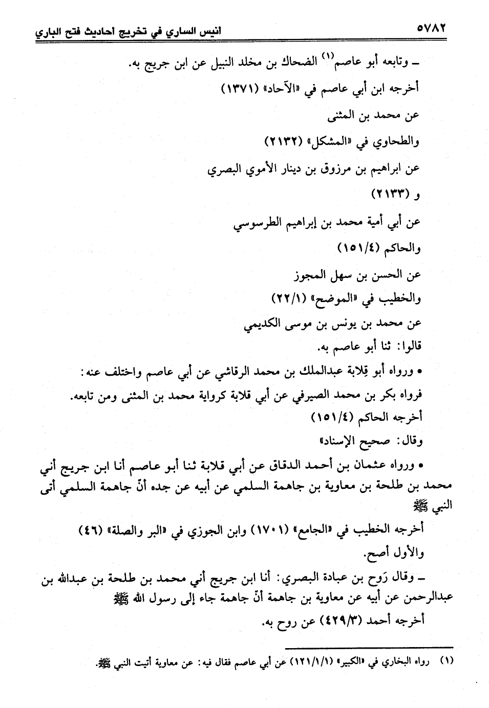- وقال رَوح بن عبادة البصري: أنا ابن جريج أنى محمد بن طلحة بن عبد الله بن عبد الرحمن عن أبيه عن معاوية بن جاهمة أنّ جاهمة جاء إلى رسول الله - صلى الله عليه وسلم -