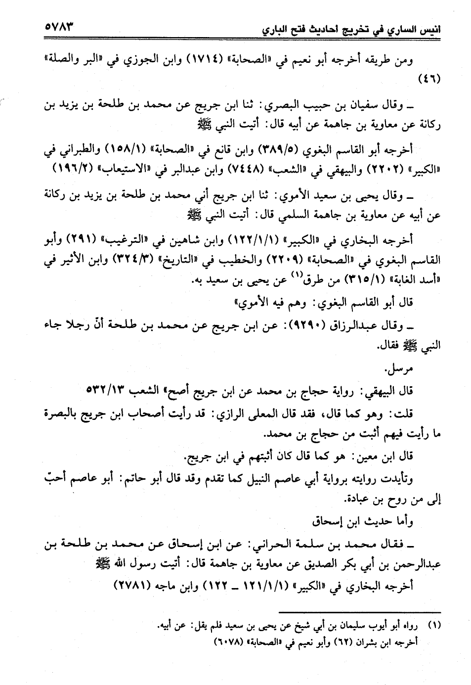- وقال سفيان بن حبيب البصري: ثنا ابن جريج عن محمد بن طلحة بن يزيد بن ركانة عن معاوية بن جاهمة عن أبيه قال: أتيت النبي - صلى الله عليه وسلم -