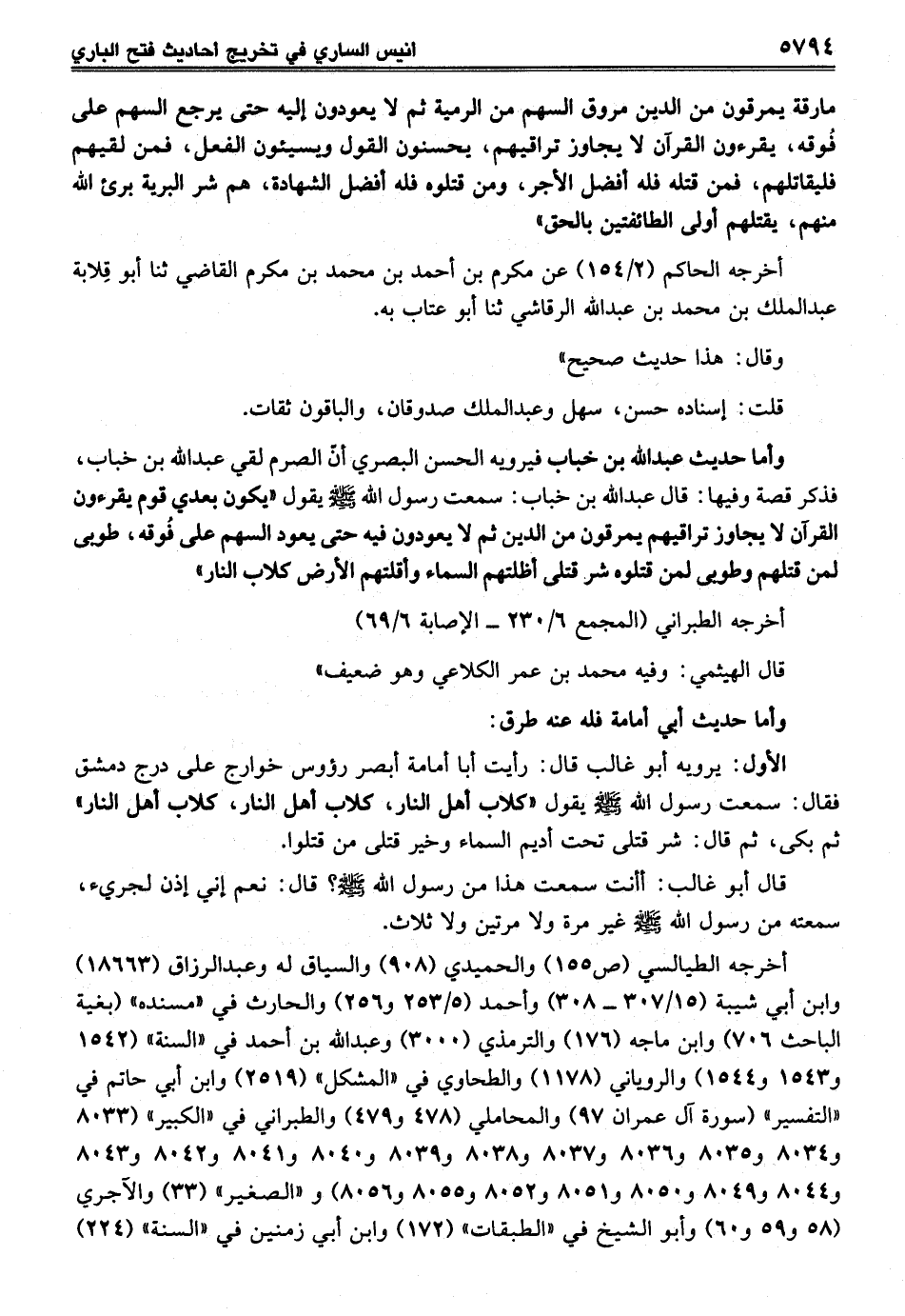 وأما حديث عبد الله بن خباب فيرويه الحسن البصري أنّ الصرم لقي عبد الله بن خباب، فذكر قصة وفيها: قال عبد الله بن خباب: سمعت رسول الله - صلى الله عليه وسلم - يقول "يكون بعدي قوم يقرءون القرآن لا يجاوز تراقيهم يمرقون من الدين ثم لا يعودون فيه حتى يعود السهم على فُوقه، طوبى لمن قتلهم وطوبى لمن قتلوه شر قتلى أظلتهم السماء وأقلتهم الأرض كلاب النار"
