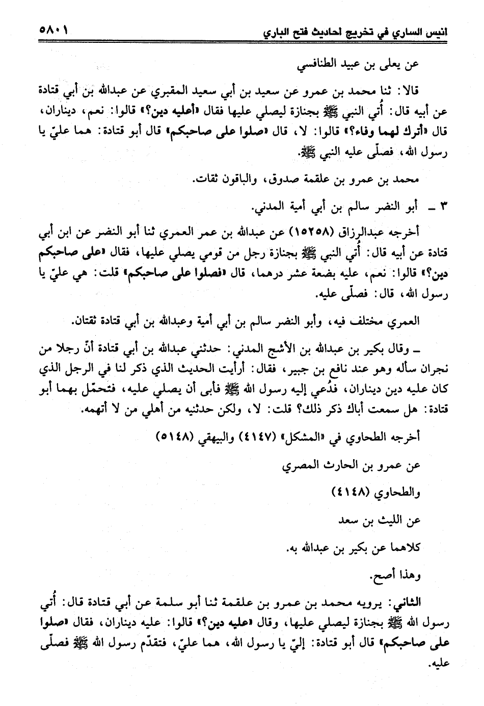 الثاني: يرويه محمد بن عمرو بن علقمة ثنا أبو سلمة عن أبي قتادة قال: أُتي رسول الله - صلى الله عليه وسلم - بجنازة ليصلي عليها، وقال "عليه دين؟ " قالوا: عليه ديناران، فقال "صلوا على صاحبكم" قال أبو قتادة: إليّ يا رسول الله، هما عليّ، فتقدّم رسول الله - صلى الله عليه وسلم - فصلّى عليه.