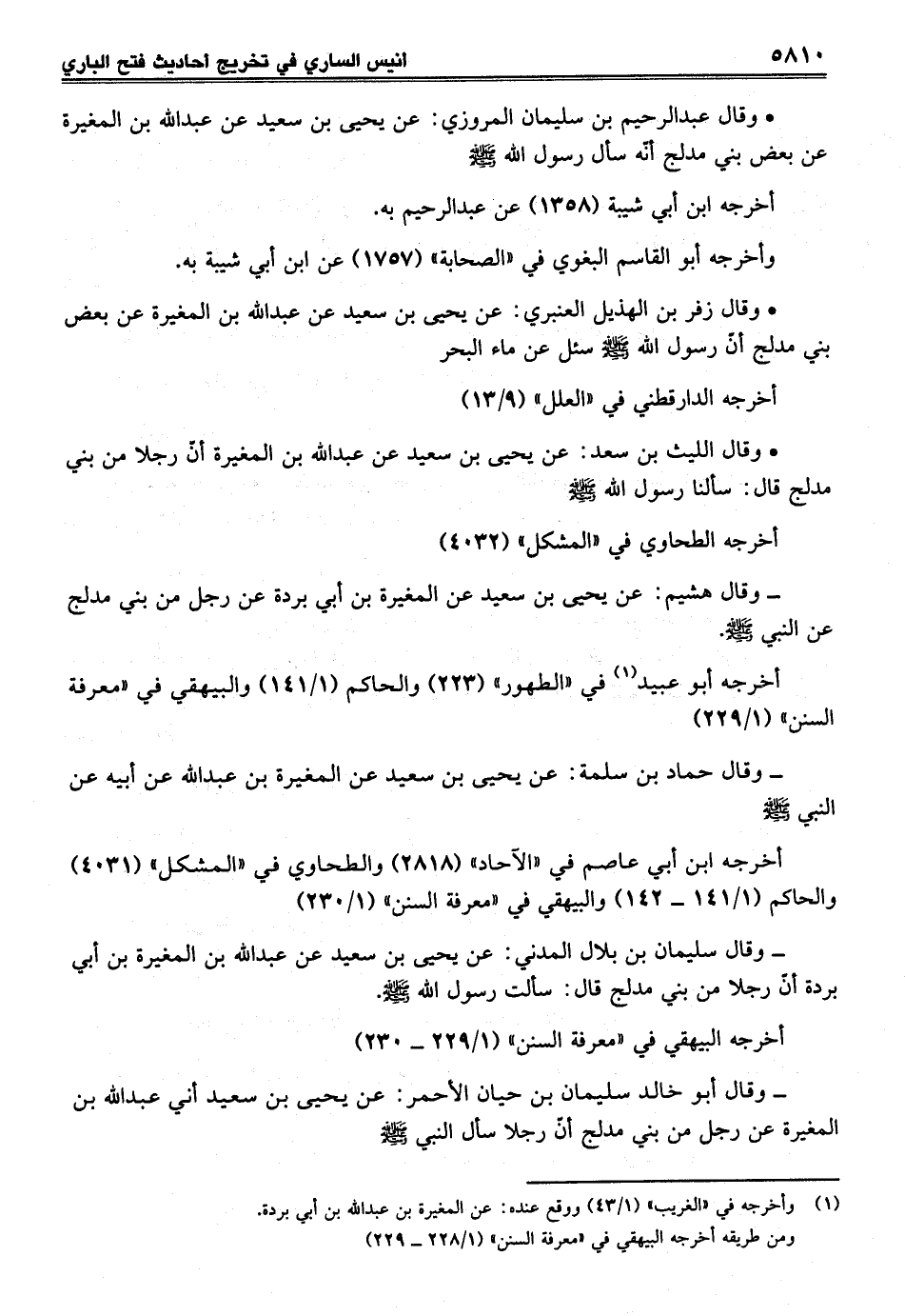 • وقال الليث بن سعد: عن يحيى بن سعيد عن عبد الله بن المغيرة أنّ رجلا من بني مدلج قال: سألنا رسول الله - صلى الله عليه وسلم -