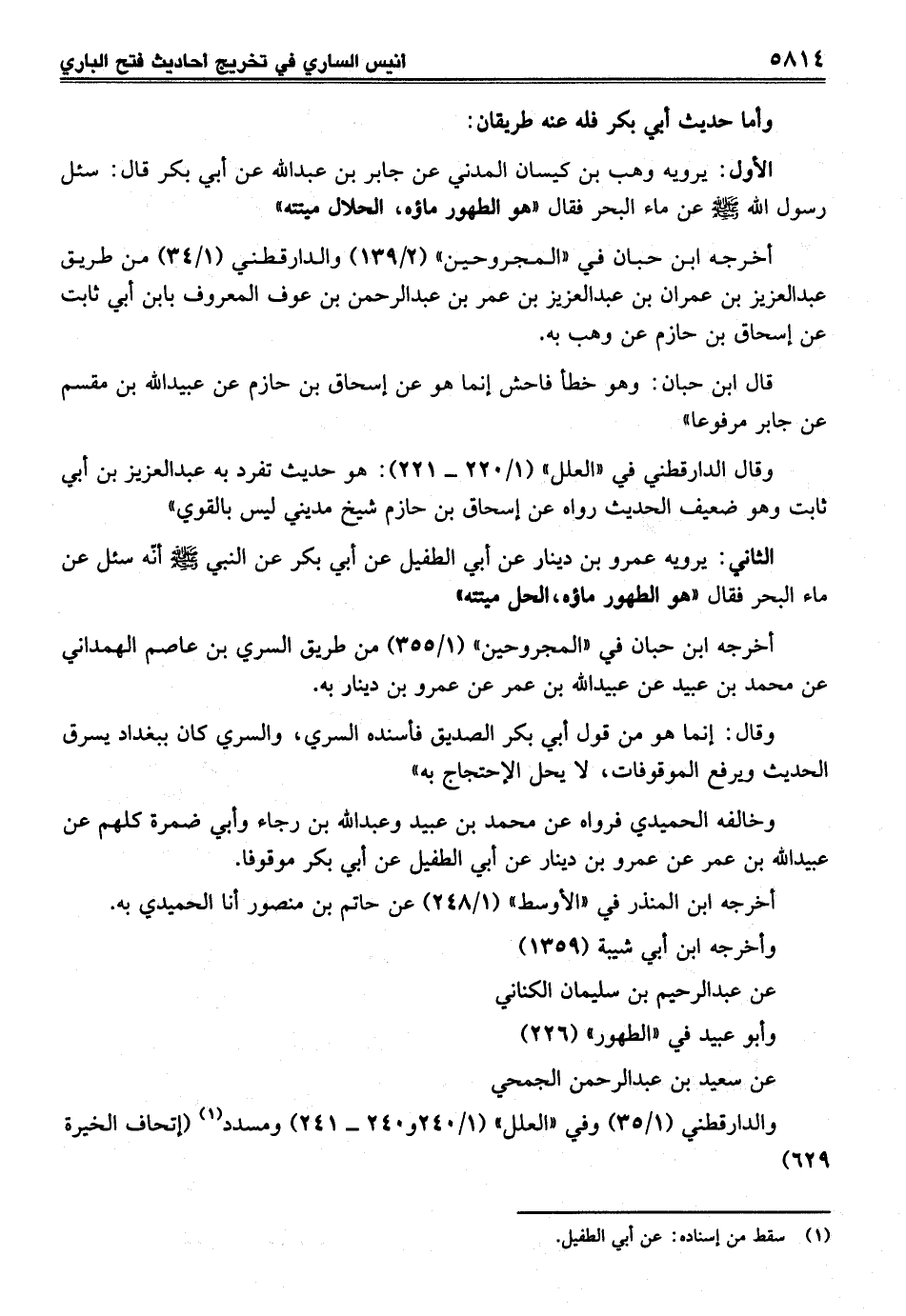 الأول: يرويه وهب بن كيسان المدني عن جابر بن عبد الله عن أبي بكر قال: سئل رسول الله - صلى الله عليه وسلم - عن ماء البحر فقال "هو الطهور ماؤه، الحلال ميتته"