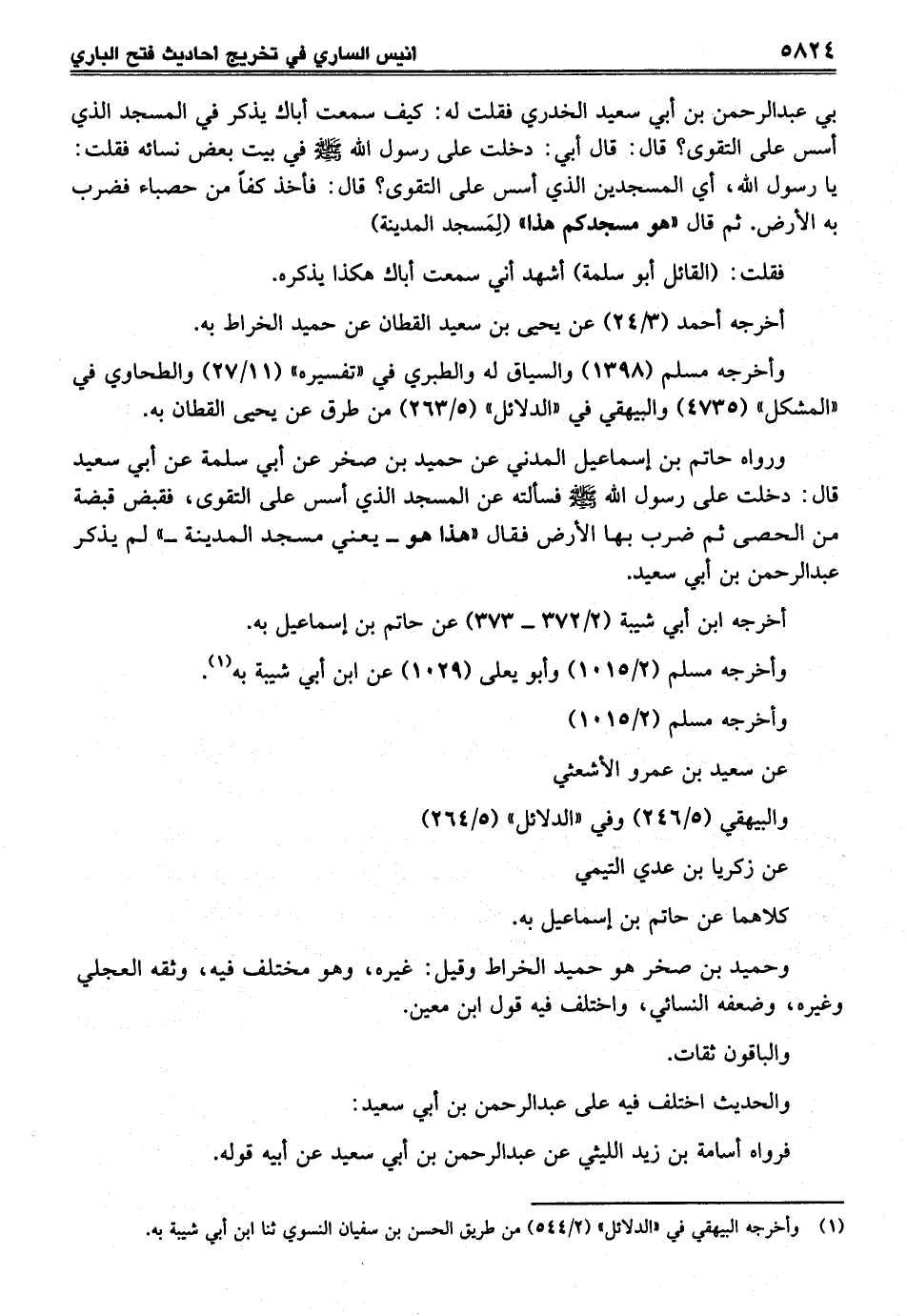 بي عبد الرحمن بن أبي سعيد الخدري فقلت له: كيف سمعت أباك يذكر في المسجد الذي أسس على التقوى؟ قال: قال أبي: دخلت على رسول الله - صلى الله عليه وسلم - في بيت بعض نسائه فقلت: يا رسول الله، أي المسجدين الذي أسس على التقوى؟ قال: فأخذ كفًا من حصباء فضرب به الأرض. ثم قال "هو مسجدكم هذا" (لِمَسجد المدينة)