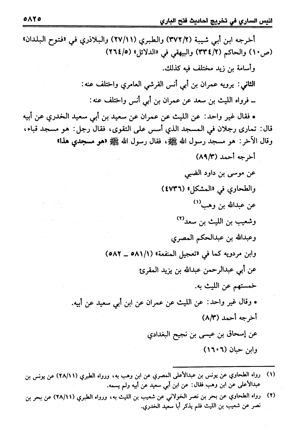 • فقال غير واحد: عن الليث عن عمران عن سعيد بن أبي سعيد الخدري عن أبيه قال: تمارى رجلان في المسجد الذي أسس على التقوى، فقال رجل: هو مسجد قباء، وقال الآخر: هو مسجد رسول الله - صلى الله عليه وسلم -، فقال رسول الله - صلى الله عليه وسلم - "هو مسجدي هذا"