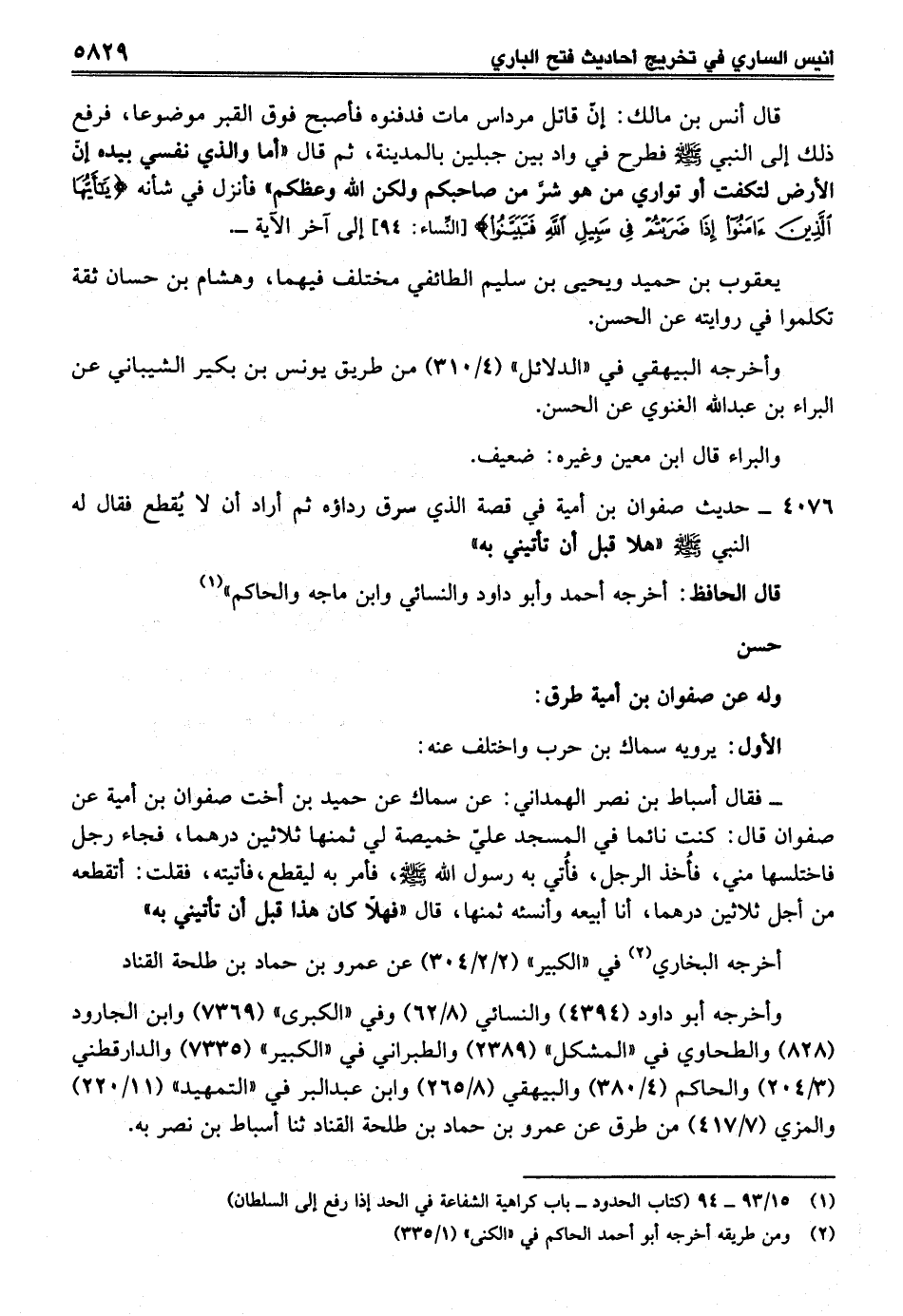 - فقال أسباط بن نصر الهمداني: عن سماك عن حميد بن أخت صفوان بن أمية عن صفوان قال: كنت نائما في المسجد عليّ خميصة لي ثمنها ثلاثين درهما، فجاء رجل فاختلسها مني، فأُخذ الرجل، فأُتي به رسول الله - صلى الله عليه وسلم -، فأمر به ليقطع، فأتيته، فقلت: أتقطعه من أجل ثلاثين درهما، أنا أبيعه وأنسئه ثمنها، قال "فهلا كان هذا قبل أن تأتيني به"