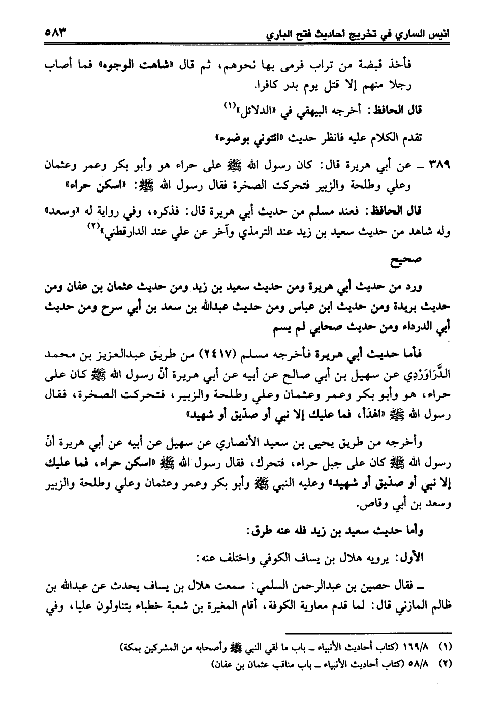 وأخرجه من طريق يحيى بن سعيد الأنصاري عن سهيل عن أبيه عن أبي هريرة أنّ رسول الله - صلى الله عليه وسلم - كان على جبل حراء، فتحرك، فقال رسول الله - صلى الله عليه وسلم - "اسكن حراء، فما عليك إلا نبي أو صدّيق أو شهيد" وعليه النبي - صلى الله عليه وسلم - وأبو بكر وعمر وعثمان وعلي وطلحة والزبير وسعد بن أبي وقاص.