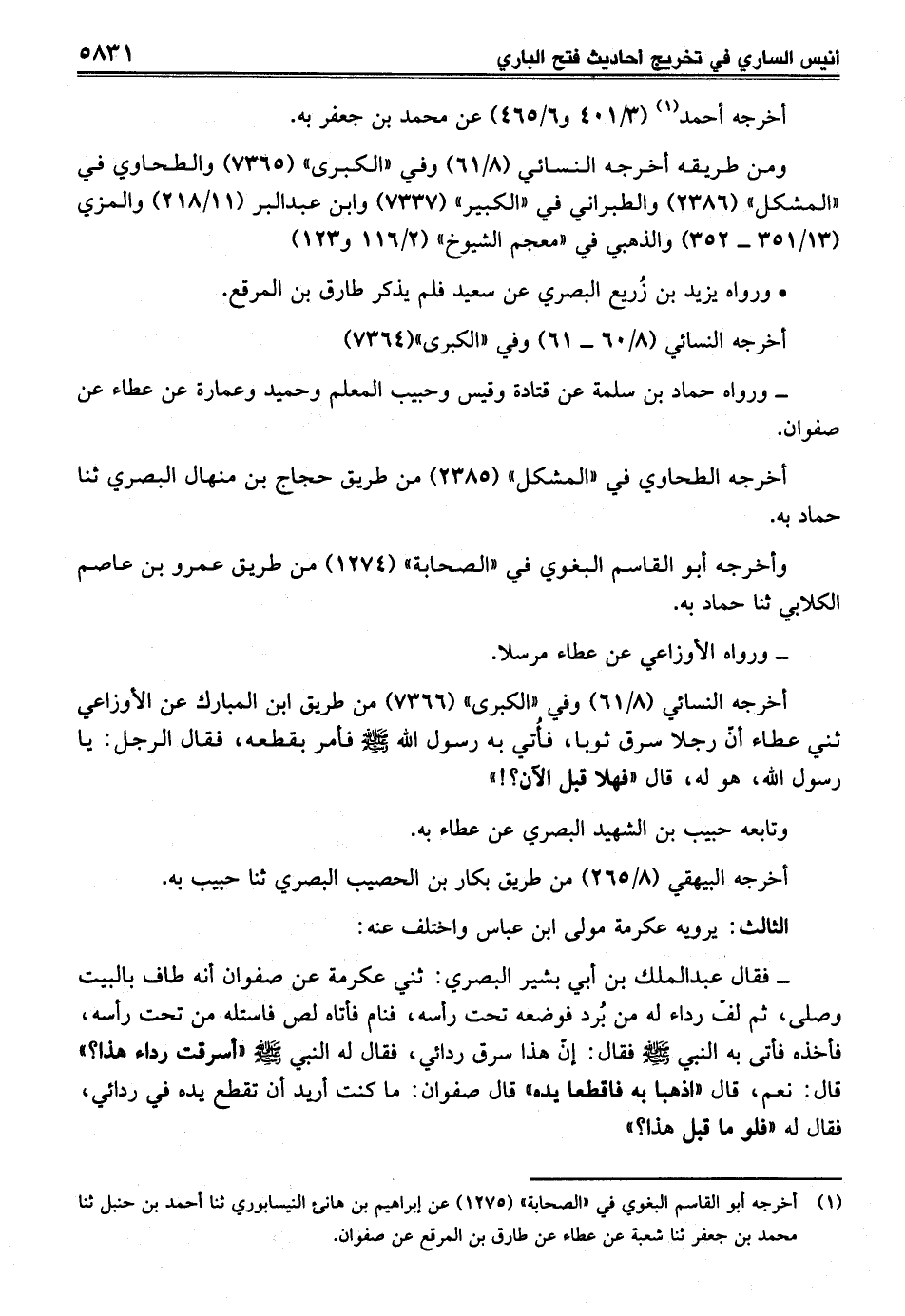 - فقال عبد الملك بن أبي بشير البصري: ثني عكرمة عن صفوان أنه طاف بالبيت وصلى، ثم لفّ رداء له من بُرد فوضعه تحت رأسه، فنام فأتاه لص فاستله من تحت رأسه، فأخذه فأتى به النبي - صلى الله عليه وسلم - فقال: إنّ هذا سرق ردائي، فقال له النبي - صلى الله عليه وسلم - "أسرقت رداء هذا؟ " قال: نعم، قال "اذهبا به فاقطعا يده" قال صفوان: ما كنت أريد أن تقطع يده في ردائي، فقال له "فلو ما قبل هذا؟ "