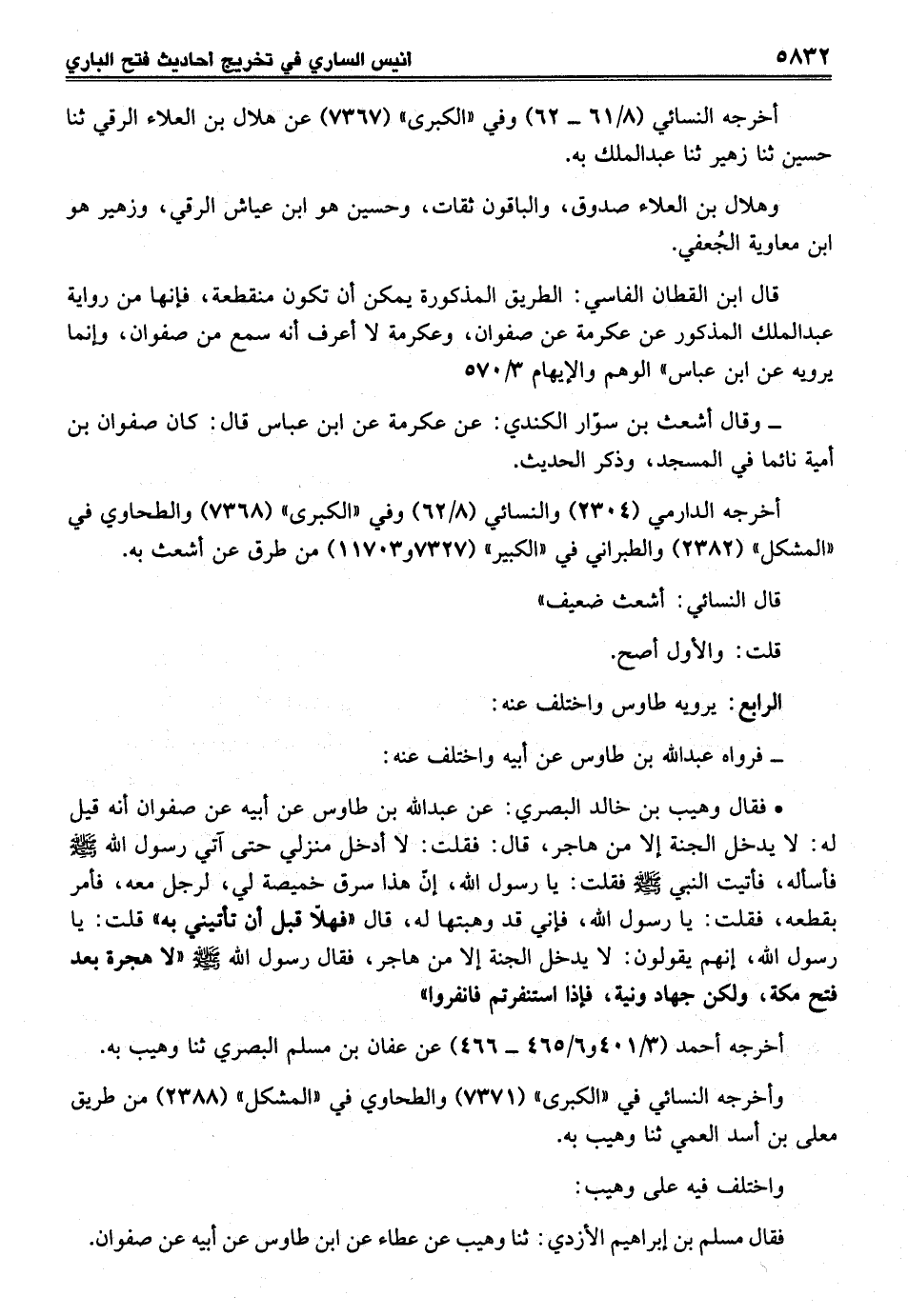 • فقال وهيب بن خالد البصري: عن عبد الله بن طاوس عن أبيه عن صفوان أنه قيل له: لا يدخل الجنة إلا من هاجر، قال: فقلت: لا أدخل منزلي حتى آتي رسول الله - صلى الله عليه وسلم - فأسأله، فأتيت النبي - صلى الله عليه وسلم - فقلت: يا رسول الله، إنّ هذا سرق خميصة لي، لرجل معه، فأمر بقطعه، فقلت: يا رسول الله، فإني قد وهبتها له، قال "فهلاّ قبل أن تأتيني به" قلت: يا رسول الله، إنهم يقولون: لا يدخل الجنة إلا من هاجر، فقال رسول الله - صلى الله عليه وسلم - "لا هجرة بعد فتح مكة، ولكن جهاد ونية، فإذا استنفرتم فانفروا"