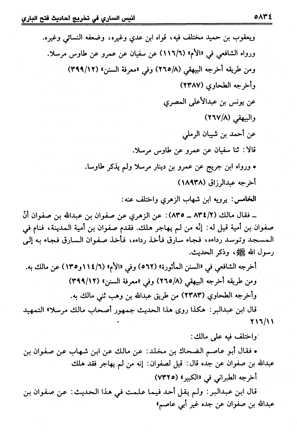 - فقال مالك (2/ 834 - 835): عن الزهري عن صفوان بن عبد الله بن صفوان أنّ صفوان بن أمية قيل له: إنّه من لم يهاجر هلك. فقدم صفوان بن أمية المدينة، فنام في المسجد وتوسد رداءه، فجاء سارق فأخذ رداءه، فأخذ صفوان السارق فجاء به إلى رسول الله - صلى الله عليه وسلم -، وذكر الحديث.