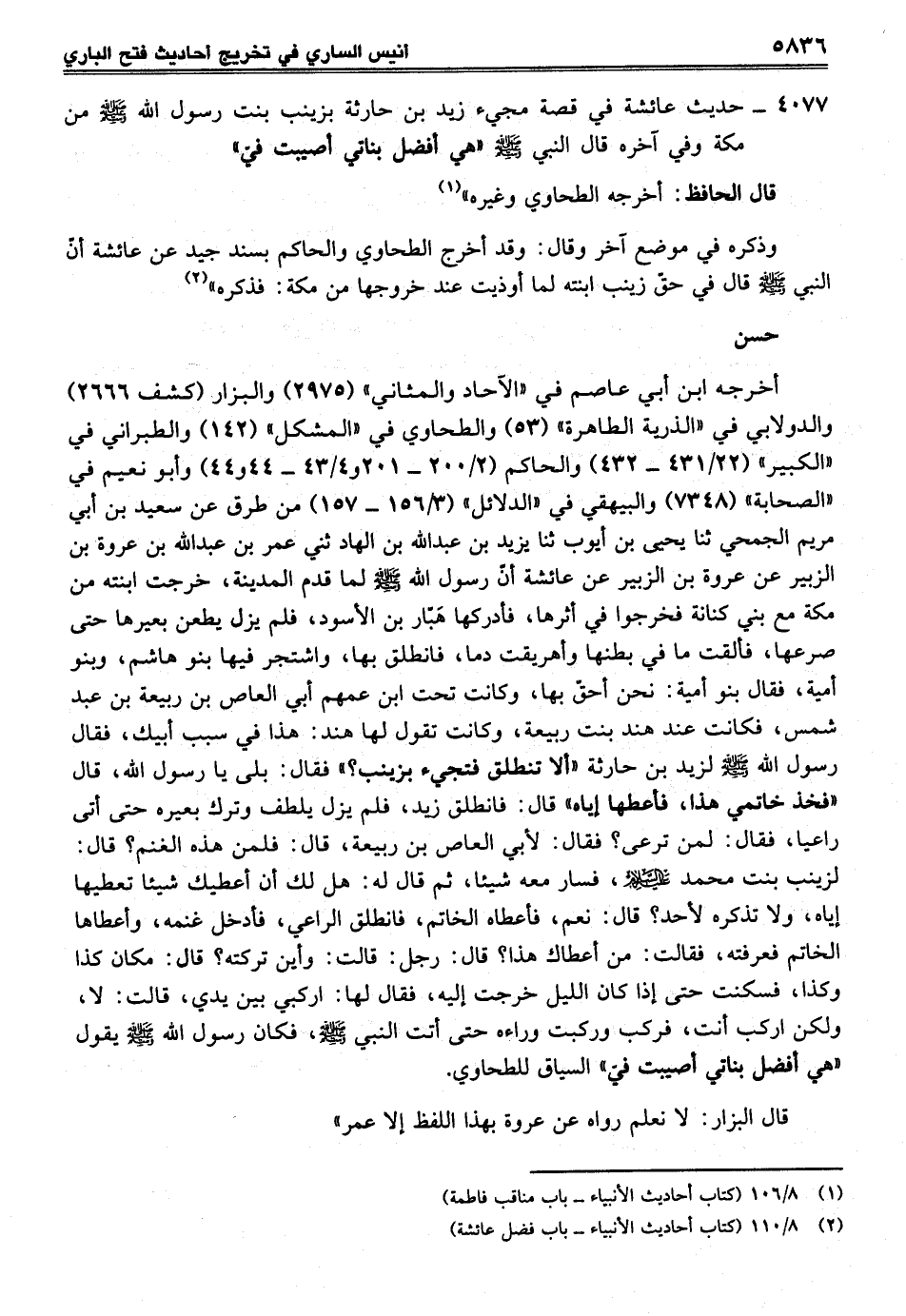 4077 - حديث عائشة في قصة مجيء زيد بن حارثة بزينب بنت رسول الله - صلى الله عليه وسلم - من مكة وفي آخره قال النبي - صلى الله عليه وسلم - "هي أفضل بناتي أصيبت فيّ"