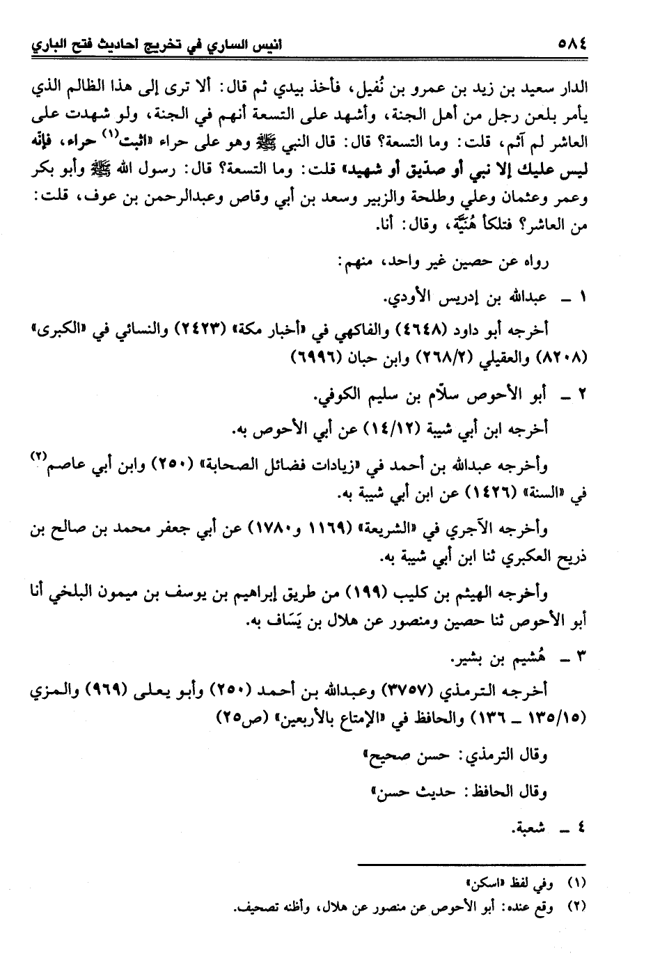 الدار سعيد بن زيد بن عمرو بن نُفيل، فأخذ بيدي ثم قال: ألا ترى إلى هذا الظالم الذي يأمر بلعن رجل من أهل الجنة، وأشهد على التسعة أنهم في الجنة، ولو شهدت على العاشر لم آثم، قلت: وما التسعة؟ قال: قال النبي - صلى الله عليه وسلم - وهو على حراء "اثبث (¬1) حراء، فإنّه ليس عليك إلا نبي أو صدّيق أو شهيد" قلت: وما التسعة؟ قال: رسول الله - صلى الله عليه وسلم - وأبو بكر وعمر وعثمان وعلي وطلحة والزبير وسعد بن أبي وقاص وعبد الرحمن بن عوف، قلت: من العاشر؟ فتلكأ هُنَيَّه، وقال: أنا.
