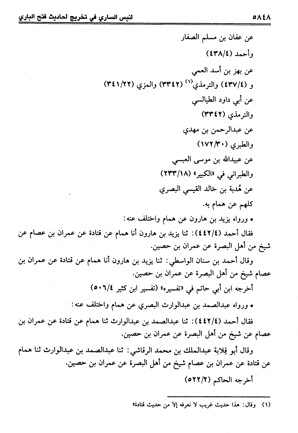 وقال أحمد بن سنان الواسطي: ثنا يزيد بن هارون أنا همام عن قتادة عن عمران بن عصام شيخ من أهل البصرة عن عمران بن حصين.