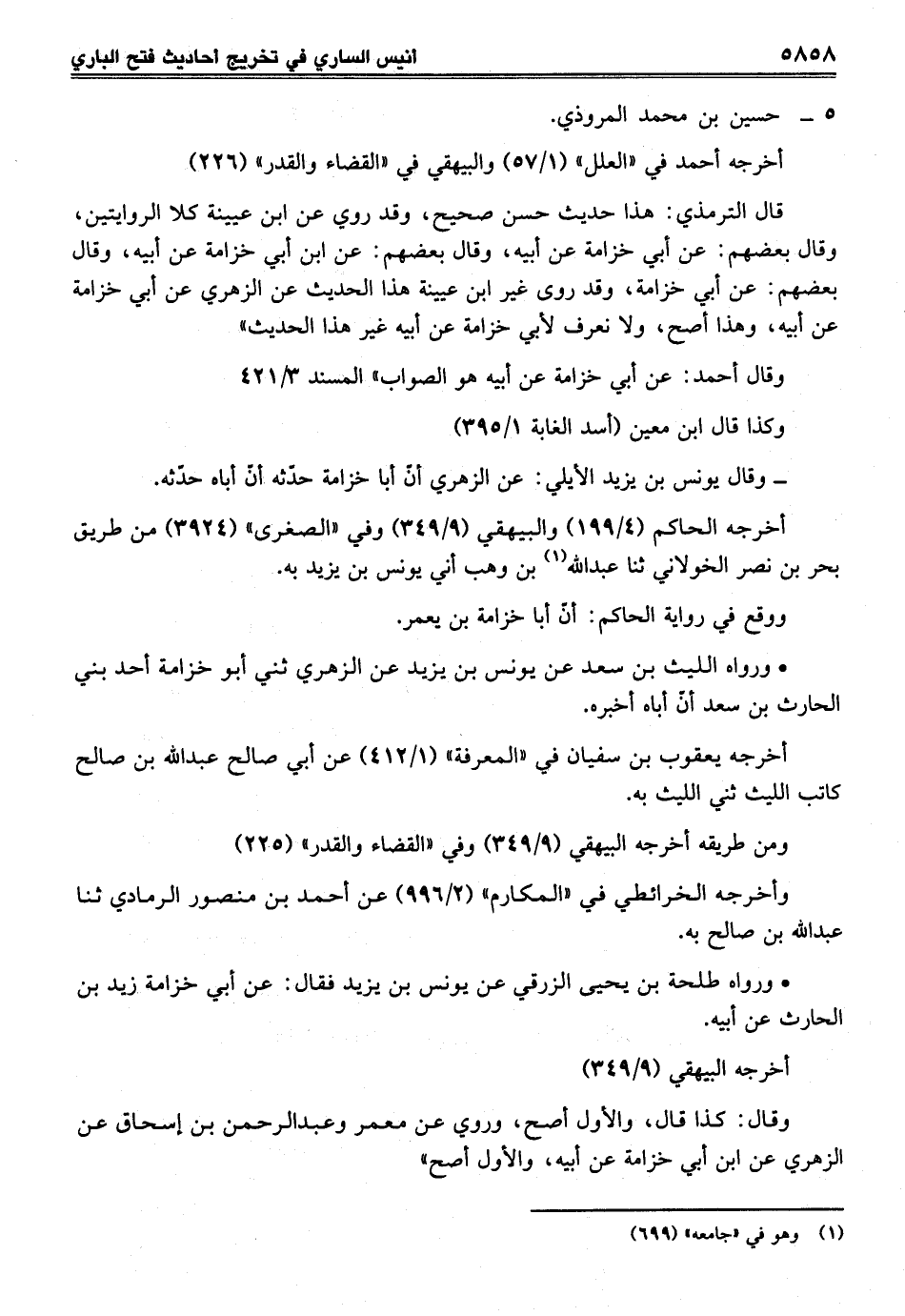 قال الترمذي: هذا حديث حسن صحيح، وقد روي عن ابن عيينة كلا الروايتين، وقال بعضهم: عن أبي خزامة عن أبيه، وقال بعضهم: عن ابن أبي خزامة عن أبيه، وقال بعضهم: عن أبي خزامة، وقد روى غير ابن عيينة هذا الحديث عن الزهري عن أبي خزامة عن أبيه، وهذا أصح، ولا نعرف لأبي خزامة عن أبيه غير هذا الحديث"