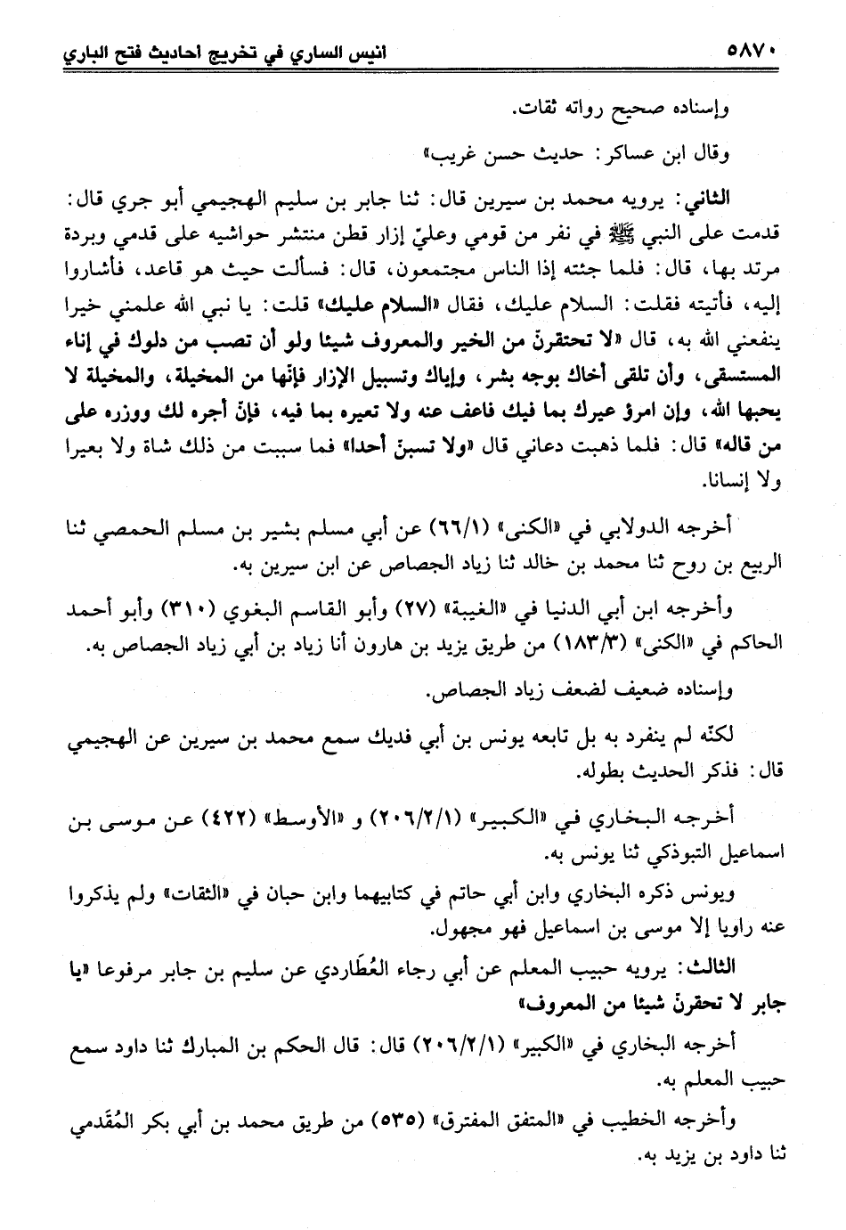 الثاني: يرويه محمد بن سيرين قال: ثنا جابر بن سليم الهجيمي أبو جري قال: قدمت على النبي - صلى الله عليه وسلم - في نفر من قومي وعليّ إزار قطن منتشر حواشيه على قدمي وبردة مرتد بها، قال: فلما جئته إذا الناس مجتمعون، قال: فسألت حيث هو قاعد، فأشاروا إليه، فأتيته فقلت: السلام عليك، فقال "السلام عليك" قلت: يا نبي الله علمني خيرا ينفعني الله به، قال "لا تحتقرنّ من الخير والمعروف شيئا ولو أن تصب من دلوك في إناء المستسقى، وأن تلقى أخاك بوجه بشر، وإياك وتسبيل الإزار فإنّها من المخيلة، والمخيلة لا يحبها الله، وإن امرؤ عيرك بما فيك فاعف عنه ولا تعيره بما فيه، فإنّ أجره لك ووزره على من قاله" قال: فلما ذهبت دعاني قال "ولا تسبنّ أحدا" فما سببت من ذلك شاة ولا بعيرا ولا إنسانا.