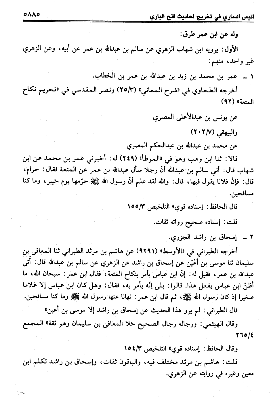 أخرجه الطبراني في "الأوسط" (9291) عن هاشم بن مرثد الطبراني ثنا المعافى بن سليمان ثنا موسى بن أعْيَن عن إسحاق بن راشد عن الزهري عن سالم بن عبد الله قال: أَتى عبد الله بن عمر، فقيل له: إنّ ابن عباس يأمر بنكاح المتعة، فقال ابن عمر: سبحان الله، ما أظن ابن عباس يفعل هذا. قالوا: بلى إنّه يأمر به، فقال: وهل كان ابن عباس إلا غلاما صغيرا إذ كان رسول الله - صلى الله عليه وسلم -، ثم قال ابن عمر: نهانا عنها رسول الله - صلى الله عليه وسلم - وما كنا مسافحين.