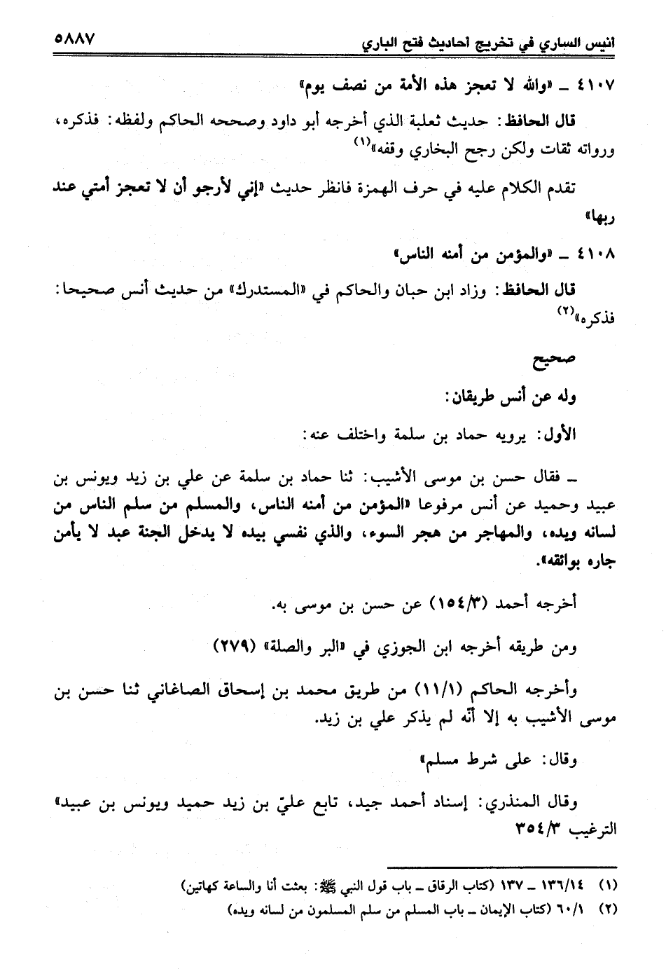 - فقال حسن بن موسى الأشيب: ثنا حماد بن سلمة عن علي بن زيد ويونس بن عبيد وحميد عن أنس مرفوعا "المؤمن من أمنه الناس، والمسلم من سلم الناس من لسانه ويده، والمهاجر من هجر السوء، والذي نفسي بيده لا يدخل الجنة عبد لا يأمن جاره بوائقه".