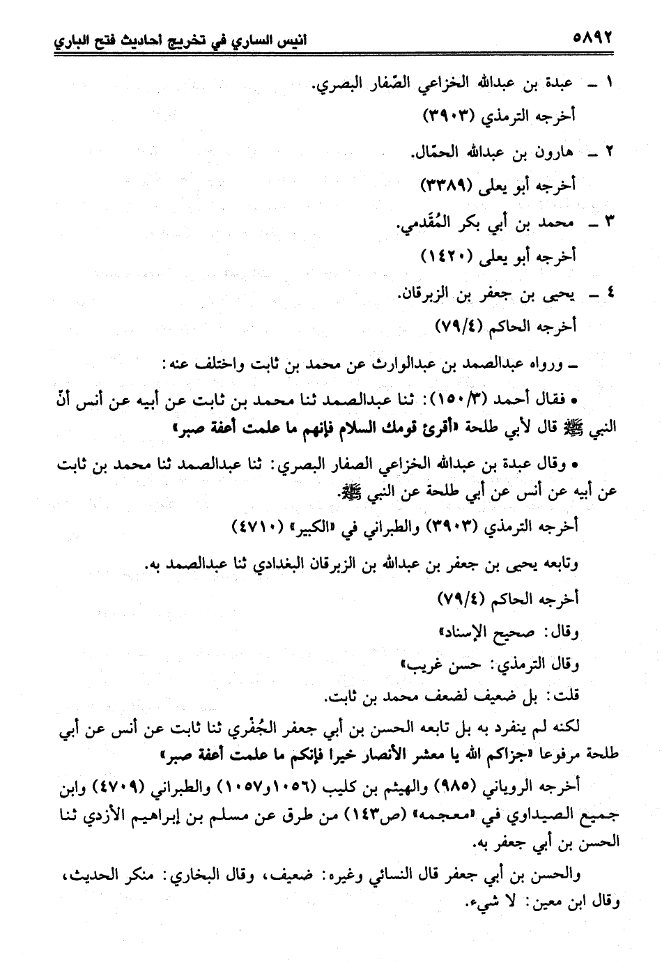 • وقال عبدة بن عبد الله الخزاعي الصفار البصري: ثنا عبد الصمد ثنا محمد بن ثابت عن أبيه عن أنس عن أبي طلحة عن النبي - صلى الله عليه وسلم -.