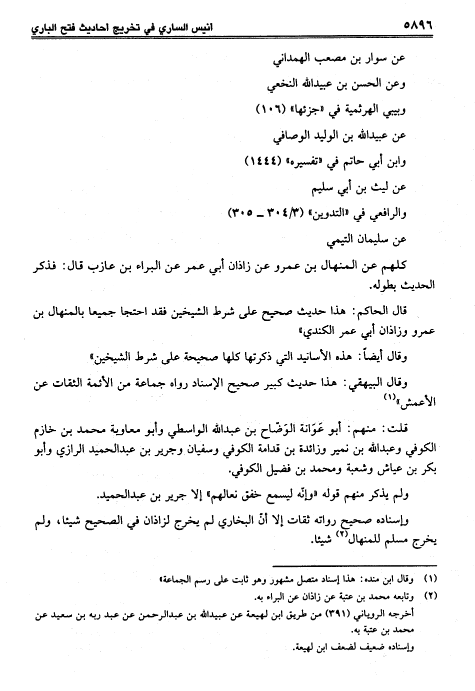 وإسناده صحيح رواته ثقات إلا أنّ البخاري لم يخرج لزاذان في الصحيح شيئا، ولم يخرج مسلم للمنهال (¬2) شيئا.