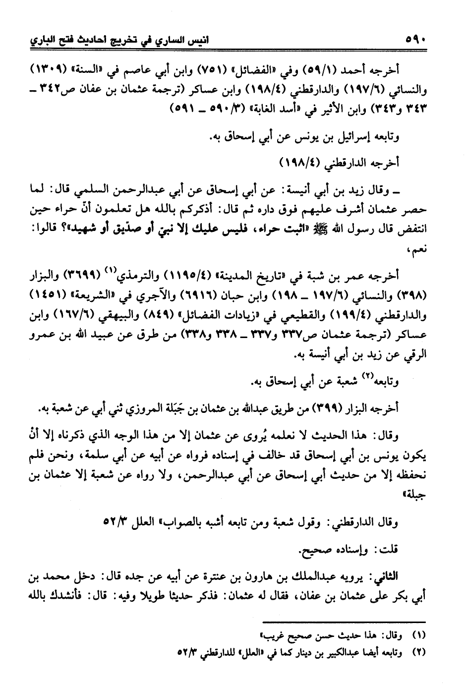- وقال زيد بن أبي أنيسة: عن أبي إسحاق عن أبي عبد الرحمن السلمي قال: لما حصر عثمان أشرف عليهم فوق داره ثم قال: أذكركم بالله هل تعلمون أنّ حراء حين انتفض قال رسول الله - صلى الله عليه وسلم - "اثبت حراء، فليس عليك إلا نبيّ أوصدّيق أو شهيد"؟ قالوا: نعم،