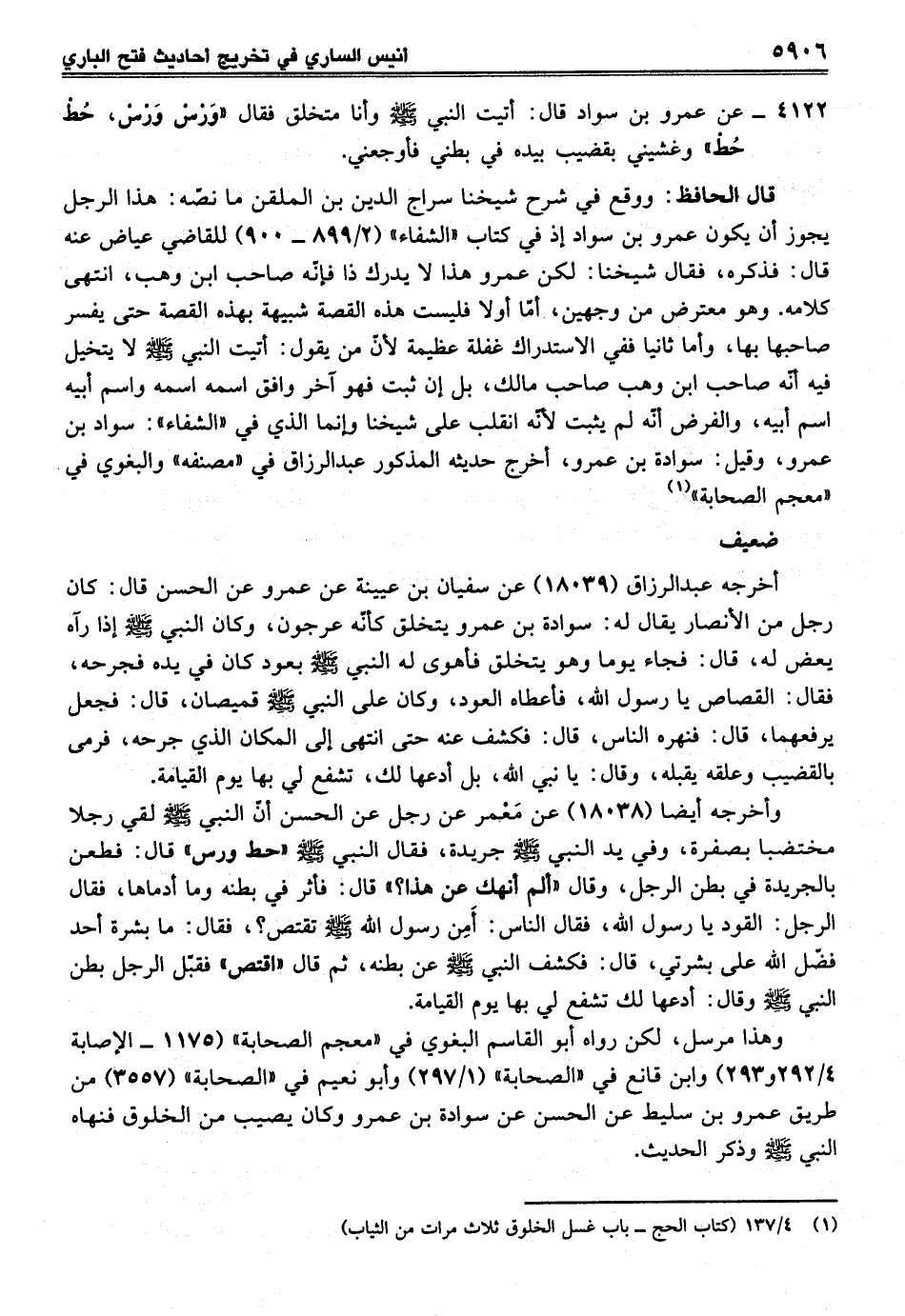 أخرجه عبد الرزاق (18039) عن سفيان بن عيينة عن عمرو عن الحسن قال: كان رجل من الأنصار يقال له: سوادة بن عمرو يتخلق كأنّه عرجون، وكان النبي - صلى الله عليه وسلم - إذا رآه يعض له، قال: فجاء يوما وهو يتخلق فأهوى له النبي - صلى الله عليه وسلم - بعود كان في يده فجرحه، فقال: القصاص يا رسول الله، فأعطاه العود، وكان على النبي - صلى الله عليه وسلم - قميصان، قال: فجعل يرفعهما، قال: فنهره الناس، قال: فكشف عنه حتى انتهى إلى المكان الذي جرحه، فرمى بالقضيب وعلقه يقبله، وقال: يا نبي الله، بل أدعها لك، تشفع لي بها يوم القيامة.