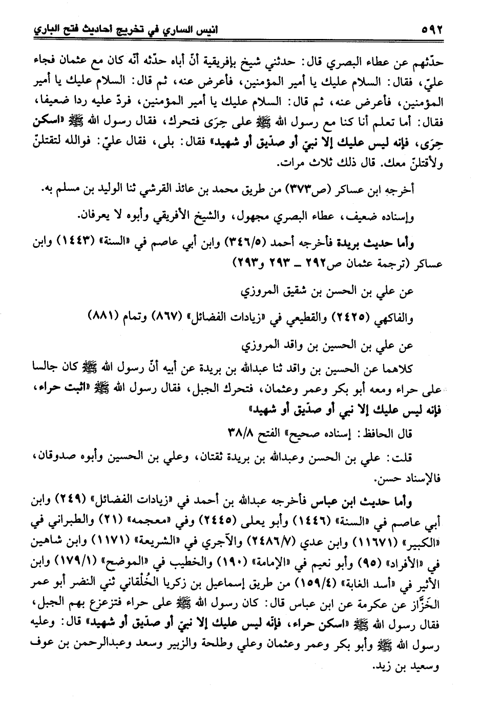 كلاهما عن الحسين بن واقد ثنا عبد الله بن بريدة عن أبيه أنّ رسول الله - صلى الله عليه وسلم - كان جالسا على حراء ومعه أبو بكر وعمر وعثمان، فتحرك الجبل، فقال رسول الله - صلى الله عليه وسلم - "اثبث حراء، فإنه ليس عليك إلا نبي أو صدّيق أو شهيد"